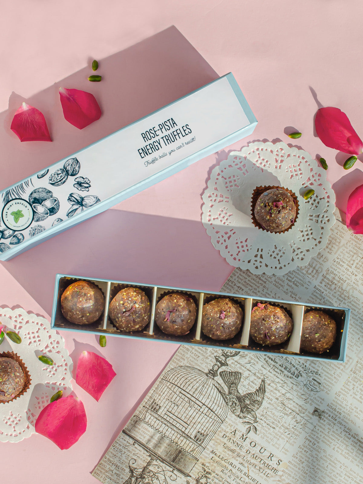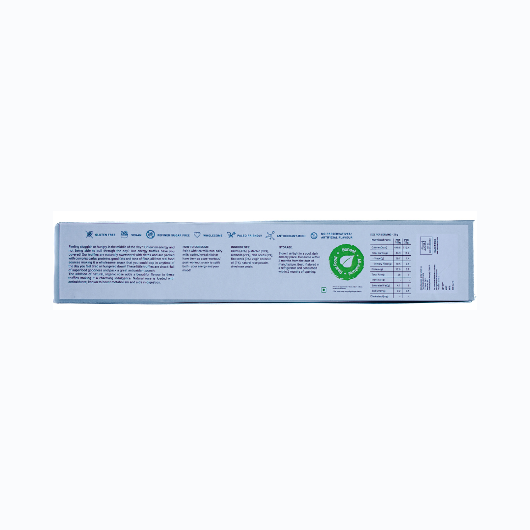 Savor these Rose Pista Truffles, sweetened naturally with dates, rich in complex carbs, proteins, and good fats,a revitalizing snack for tired or hunger-induced moments! Enhanced by natural, organic rose, these truffles offer a charming flavor. Packed with antioxidants, the natural rose aids digestion, creating a delightful, wholesome indulgence. Crafted sustainably in India, it's a guilt-free delight.