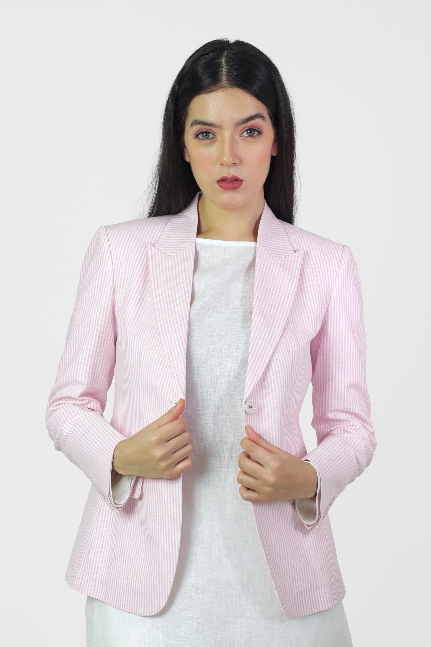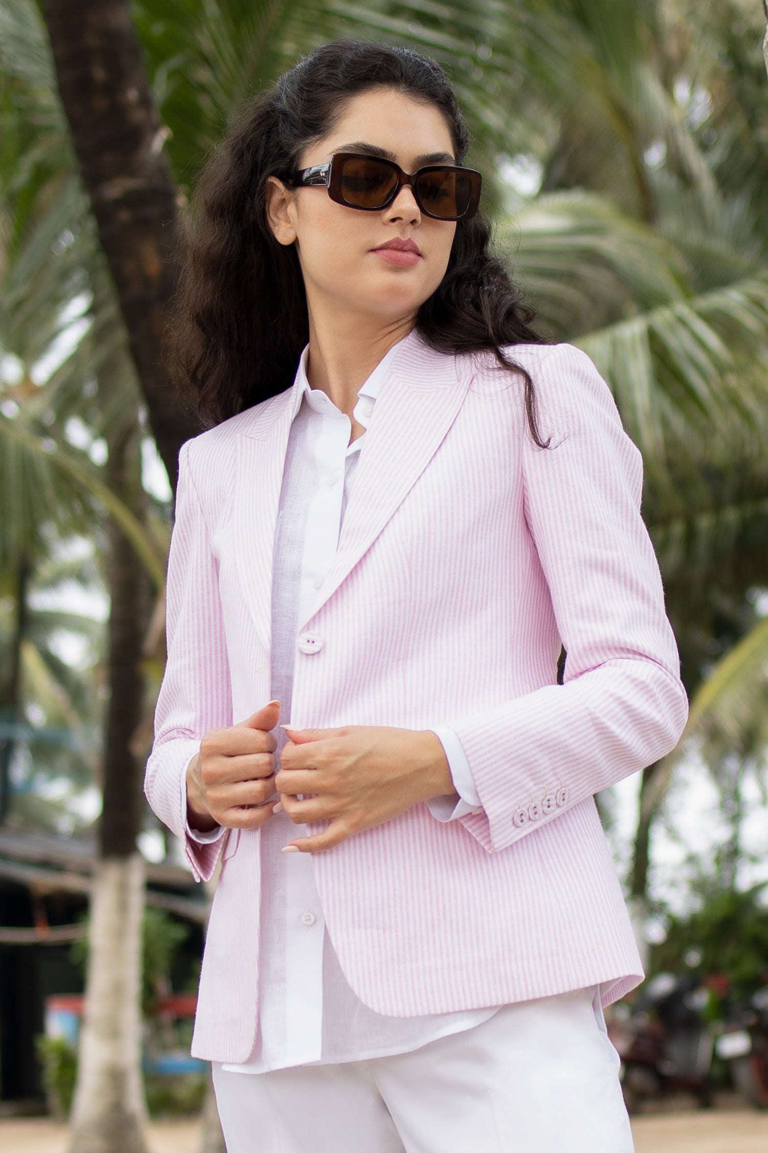 The Ruby Linen blazer is designed in a pink and blue colored striped 40- Lea European Linen that offers texture and visual depth without sacrificing breathability. It is designed to be easily dressed differently, whether worn over a simple top or a crisp button-down, due to its refined tailoring and relaxed, two-button silhouette.