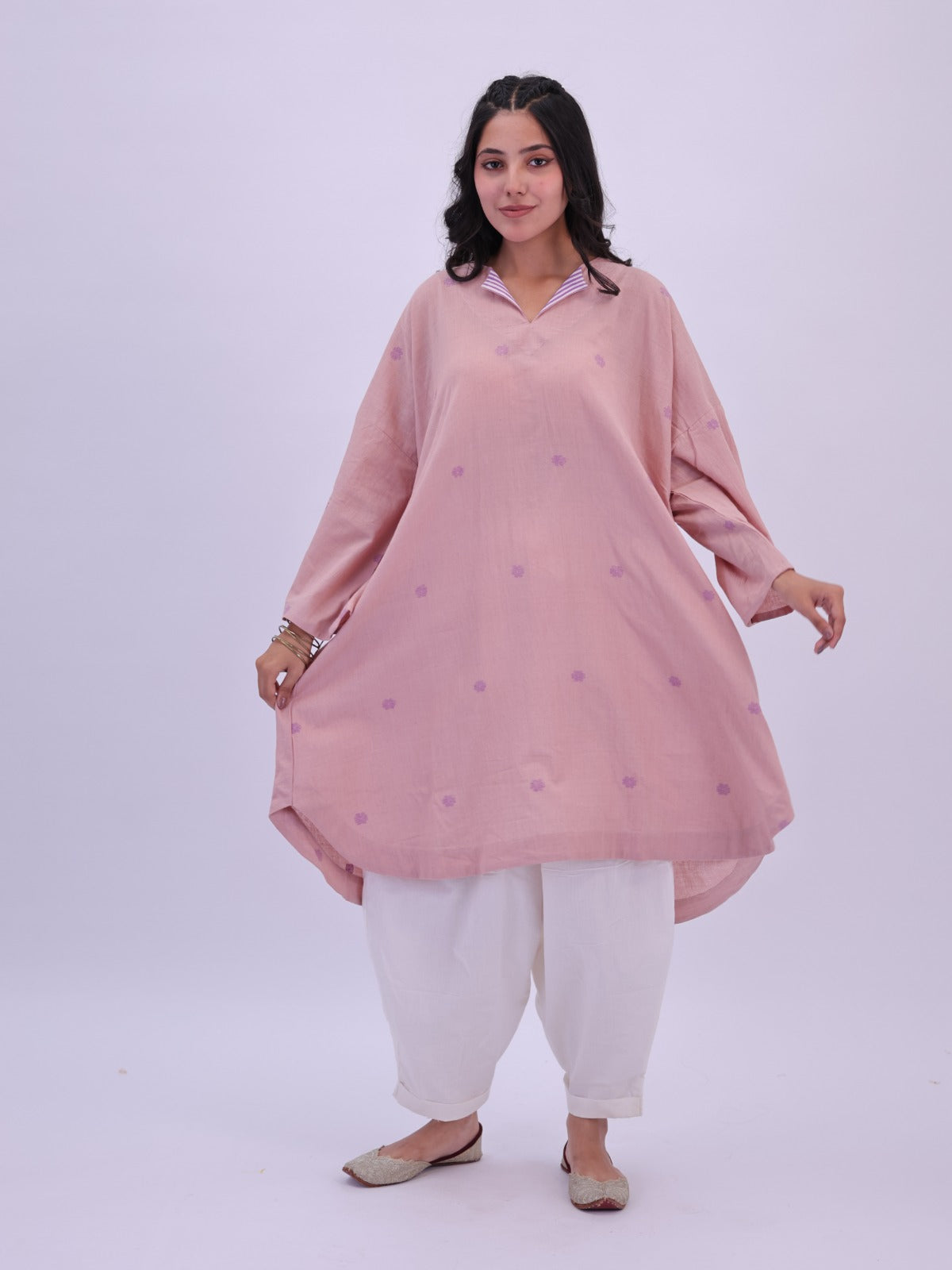 Embrace the beauty of traditional craftsmanship with this exquisite Jamdani cotton tunic, handcrafted by skilled artisans from Bengal. Woven from high-quality, handspun cotton, it features kimono sleeves, drop shoulders, and a relaxed silhouette for all-day comfort and effortless style. The intricate Jamdani weave makes each piece a unique expression of heritage. A perfect choice for those who value ethnic elegance and conscious fashion, this free-size kurta seamlessly blends timeless tradition with a modern edge.