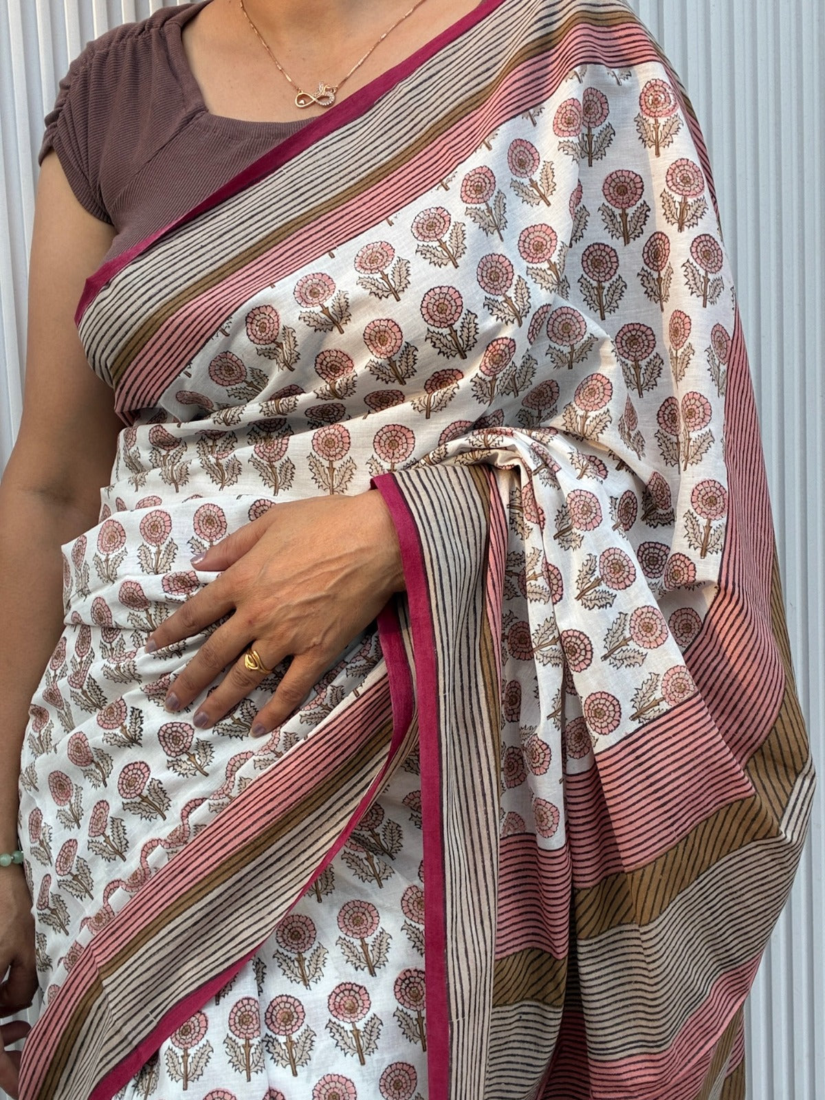 Handcrafted in pure cotton with Sanganeri block prints, this saree is made by Jaipur’s National Award-Winning artisans using Azo-Free dyes. The airy drape and delicate motifs reflect centuries of tradition—crafted for effortless, modern sophistication.