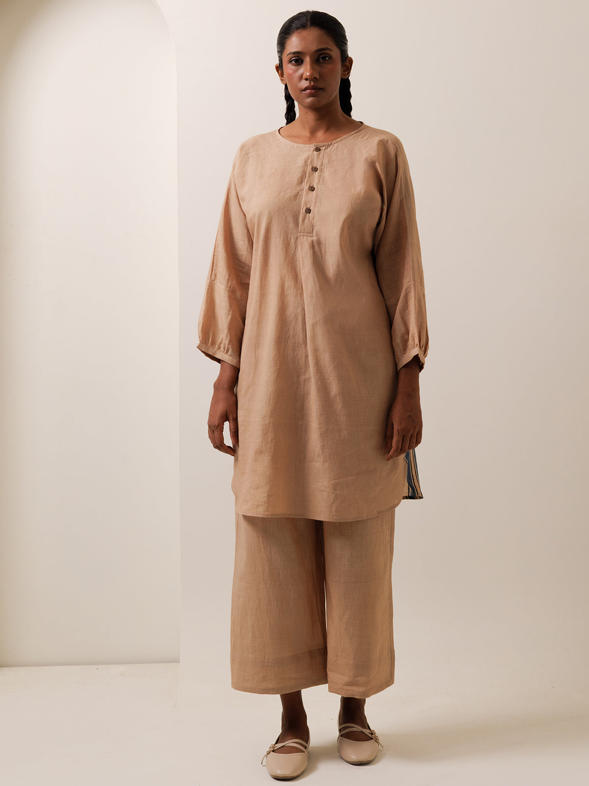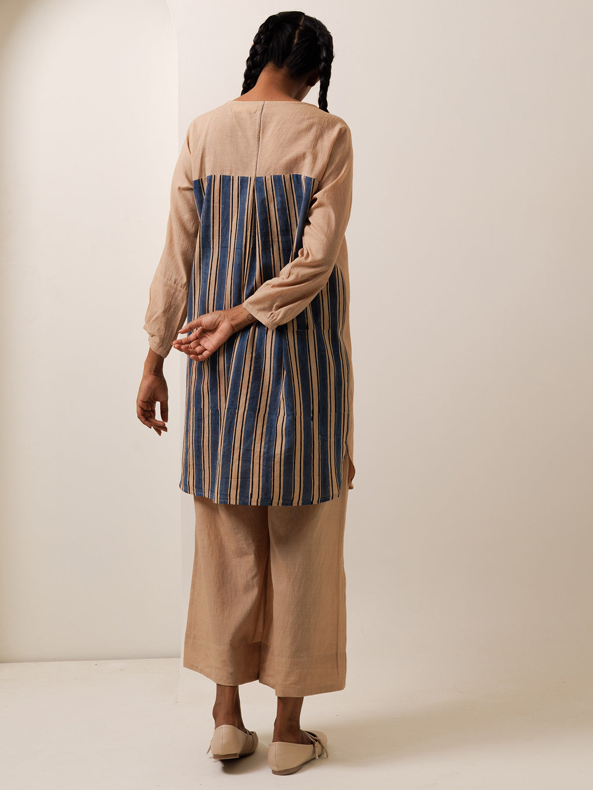 Sand & Water kurta set made in handwoven bengal cotton, kurta featuring a front centre button placket and a hand-block printed back panel. Trousers are straight fitted with wide legged bottom and pockets, both finished with fagoting side seamlines.