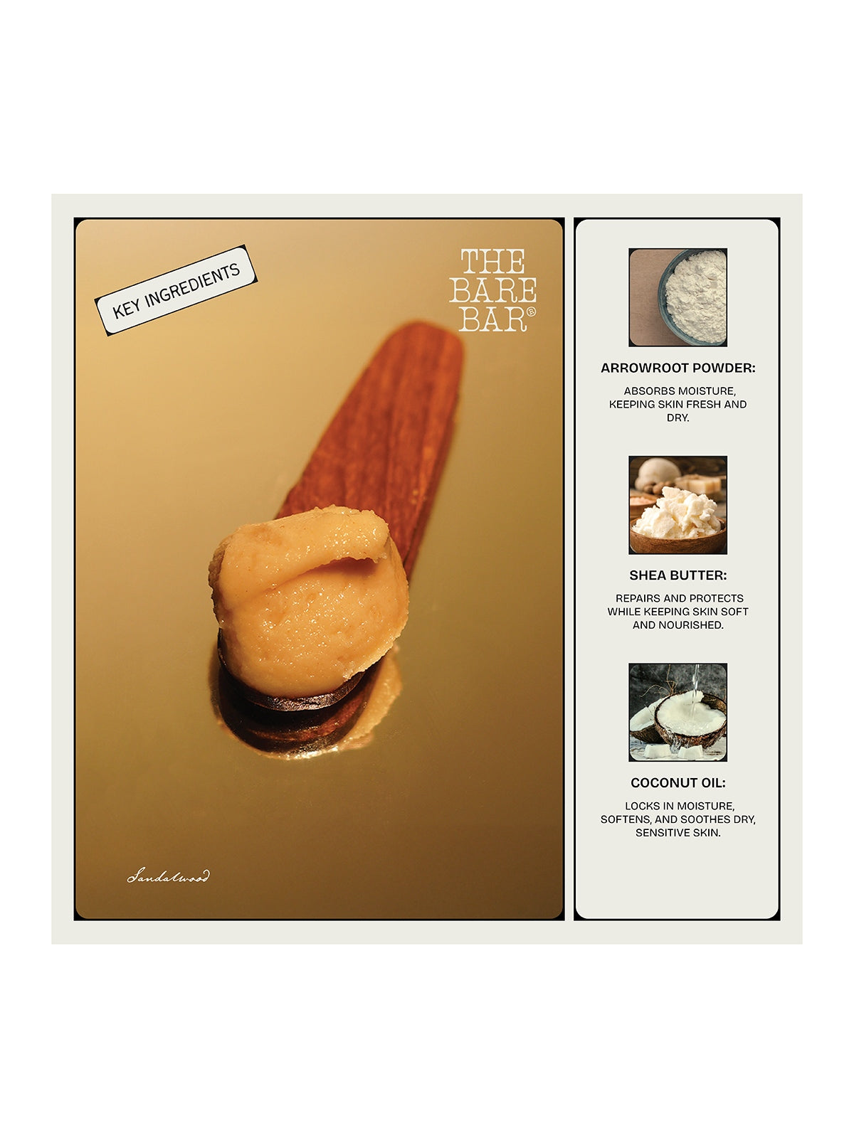- Key Ingredients : Ingredients: Maranta arundinacea (Arrowroot) Powder, Cocos nucifera (Coconut) Oil, Vitellaria paradoxa (Shea) Butter, Magnifera indica (Mango) Butter, Copernicia cerifera (Carnauba) Wax, Euphorbia cerifera (Candelilla) Wax, Glycine soja (Soybean) Wax, Santalum album (Sandalwood) Oil, Cananga odorata (Ylang ylang) Flower Oil, Sodium Bicarbonate, Vitamin E Acetate.