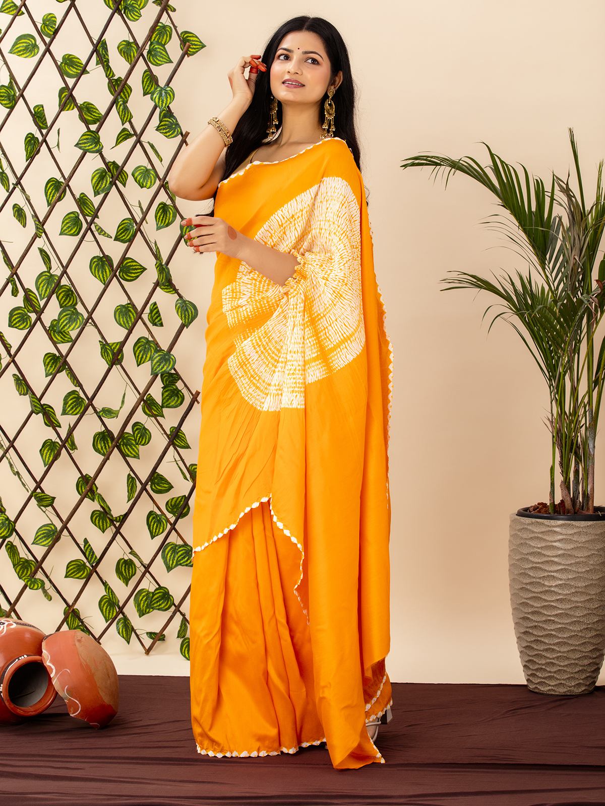 Shibori Bandhani Tiw And Dye Pure Chanderi Handsfree Saree White And Yellow Color