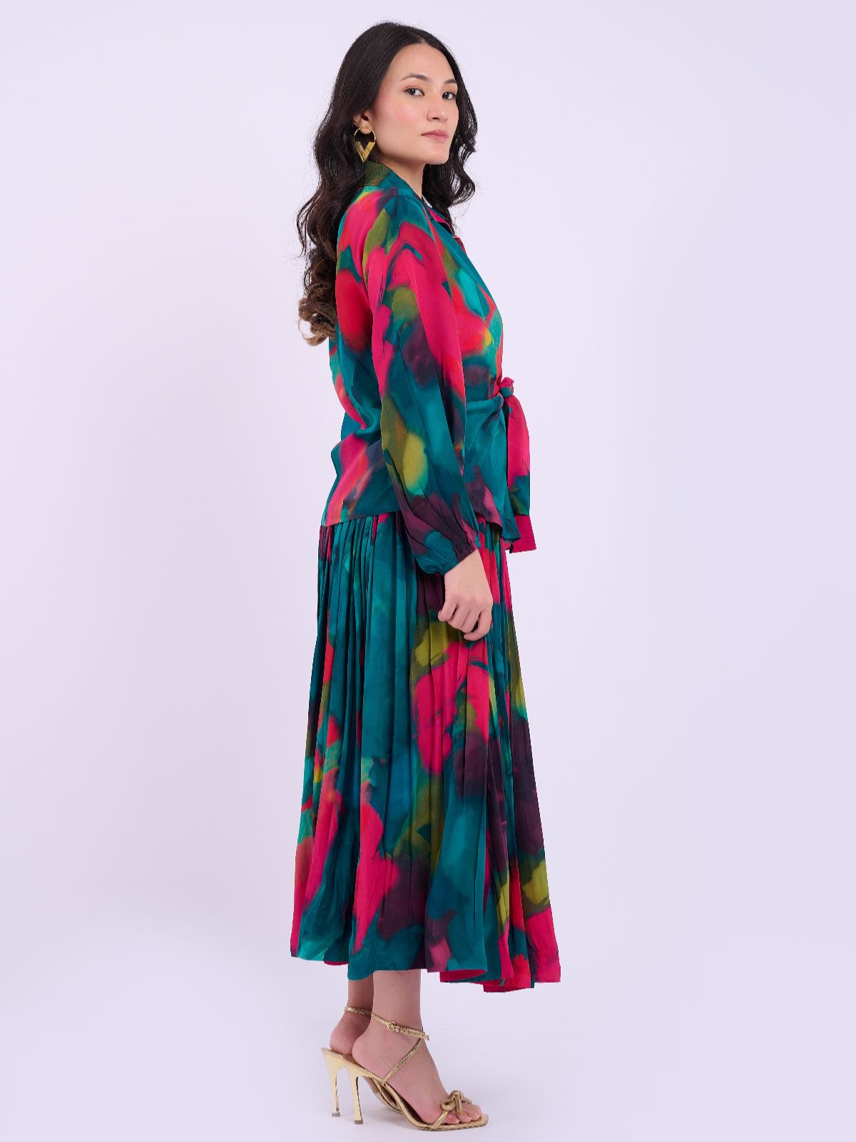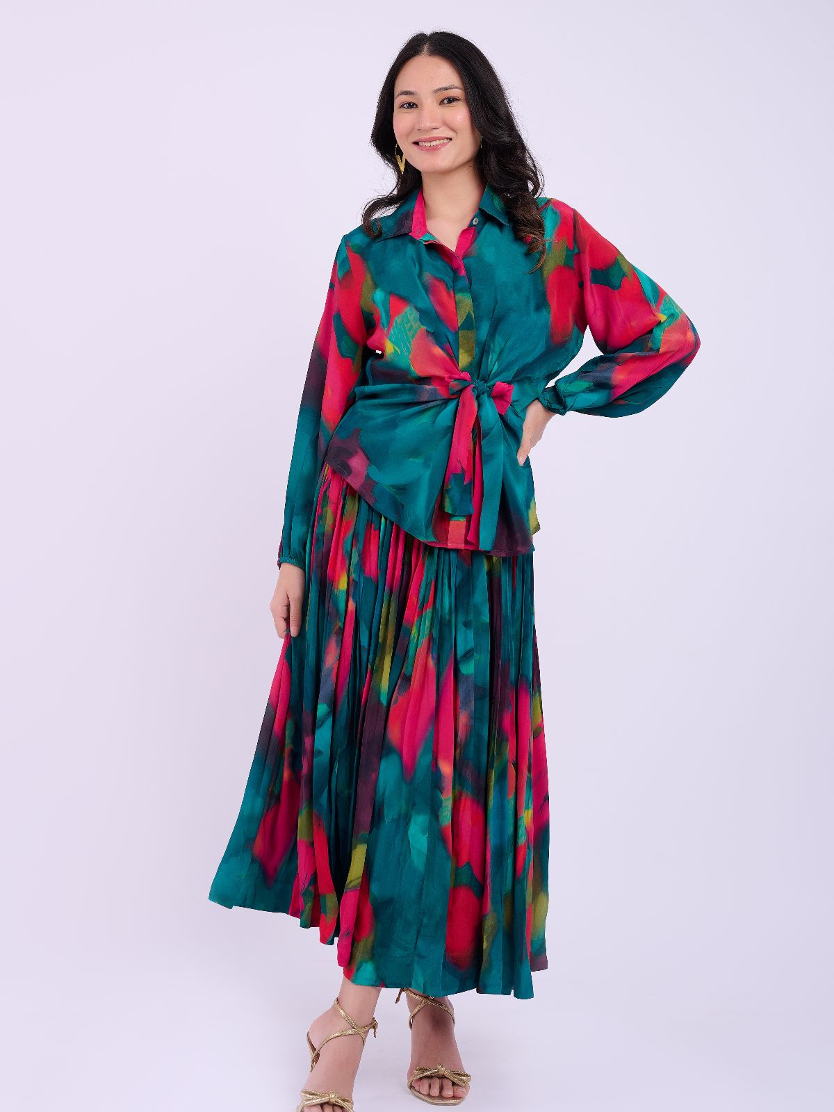 Step into statement style with the Skylar Skirt Set , crafted in fluid crepe with a vibrant abstract green print infused with bold strokes of fuchsia and deep teal. The tie-front detail adds a flattering touch, while the relaxed fit and soft drape make it effortlessly chic. Whether styled for brunch or a cocktail soirée, this shirt adds color and confidence to every look.