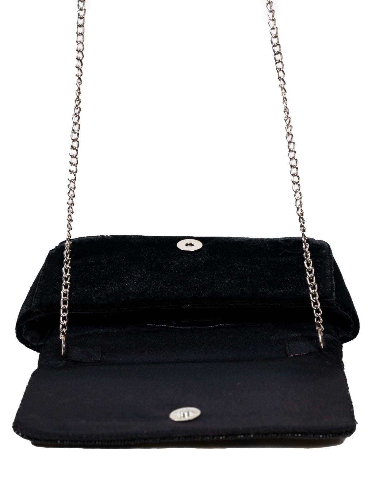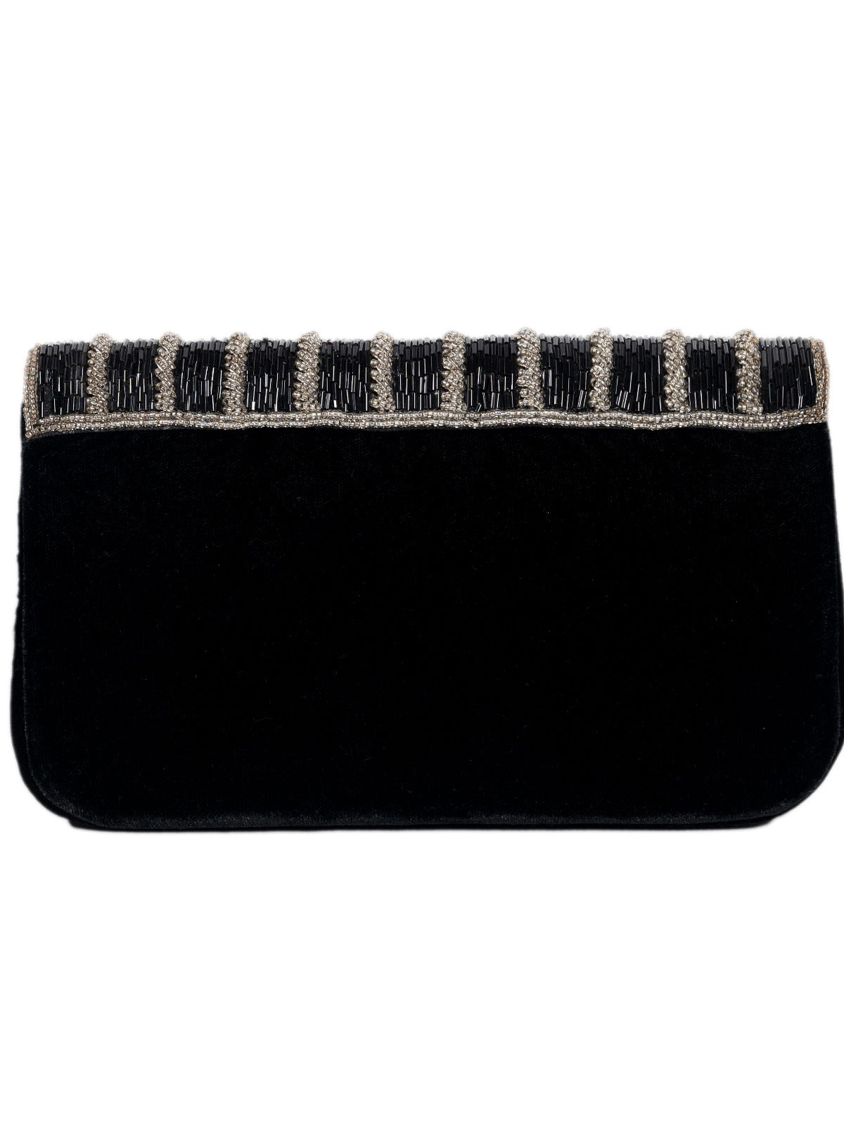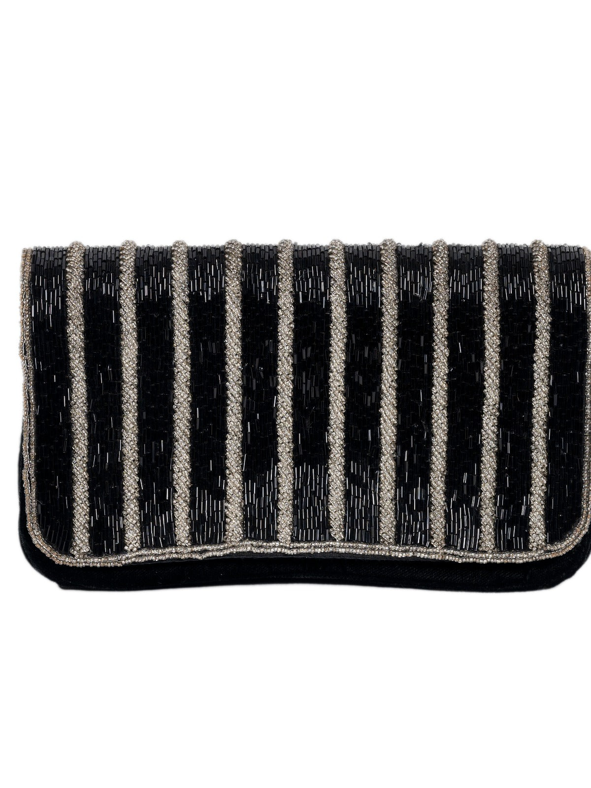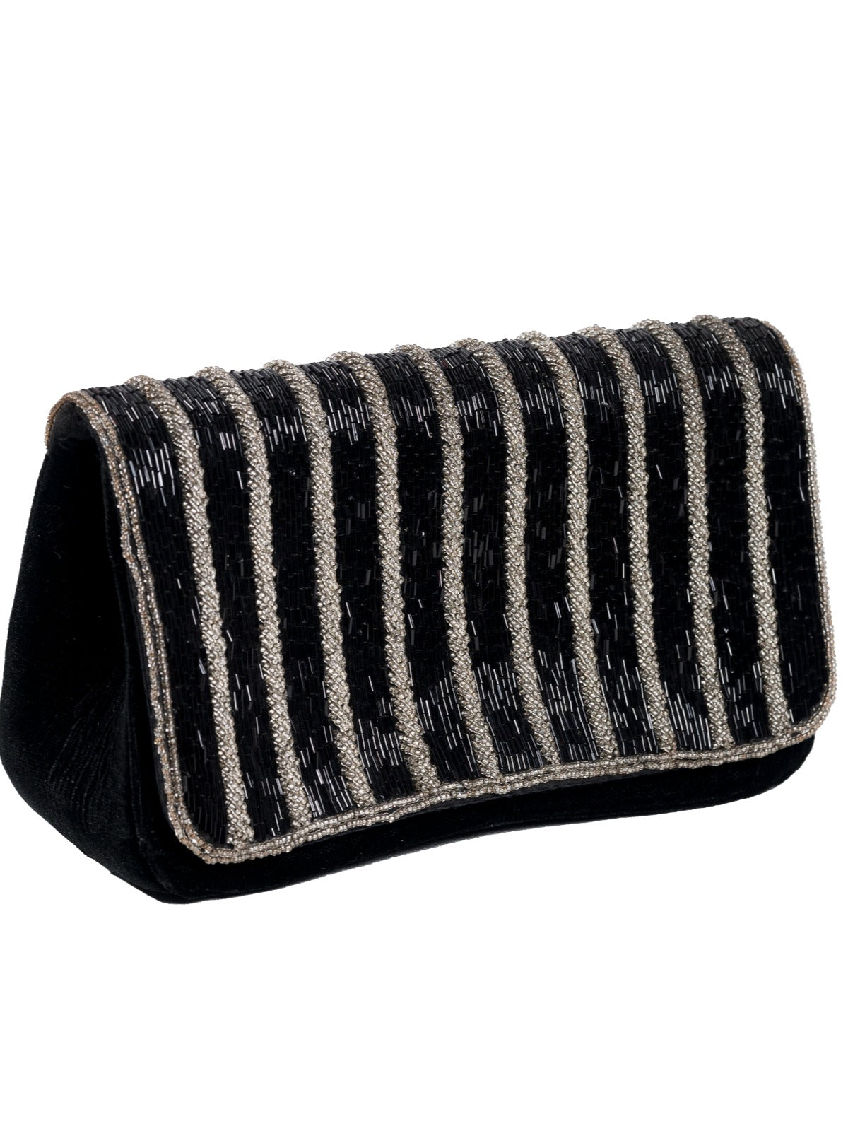 This elegant evening purse captures the essence of moonlight on water through its rhythmic pattern of silver beadwork on rich black fabric. Crafted by skilled artisans from Muradabad, the undulating lines of beads create a hypnotic wave effect that adds movement and sophistication to any evening ensemble.
