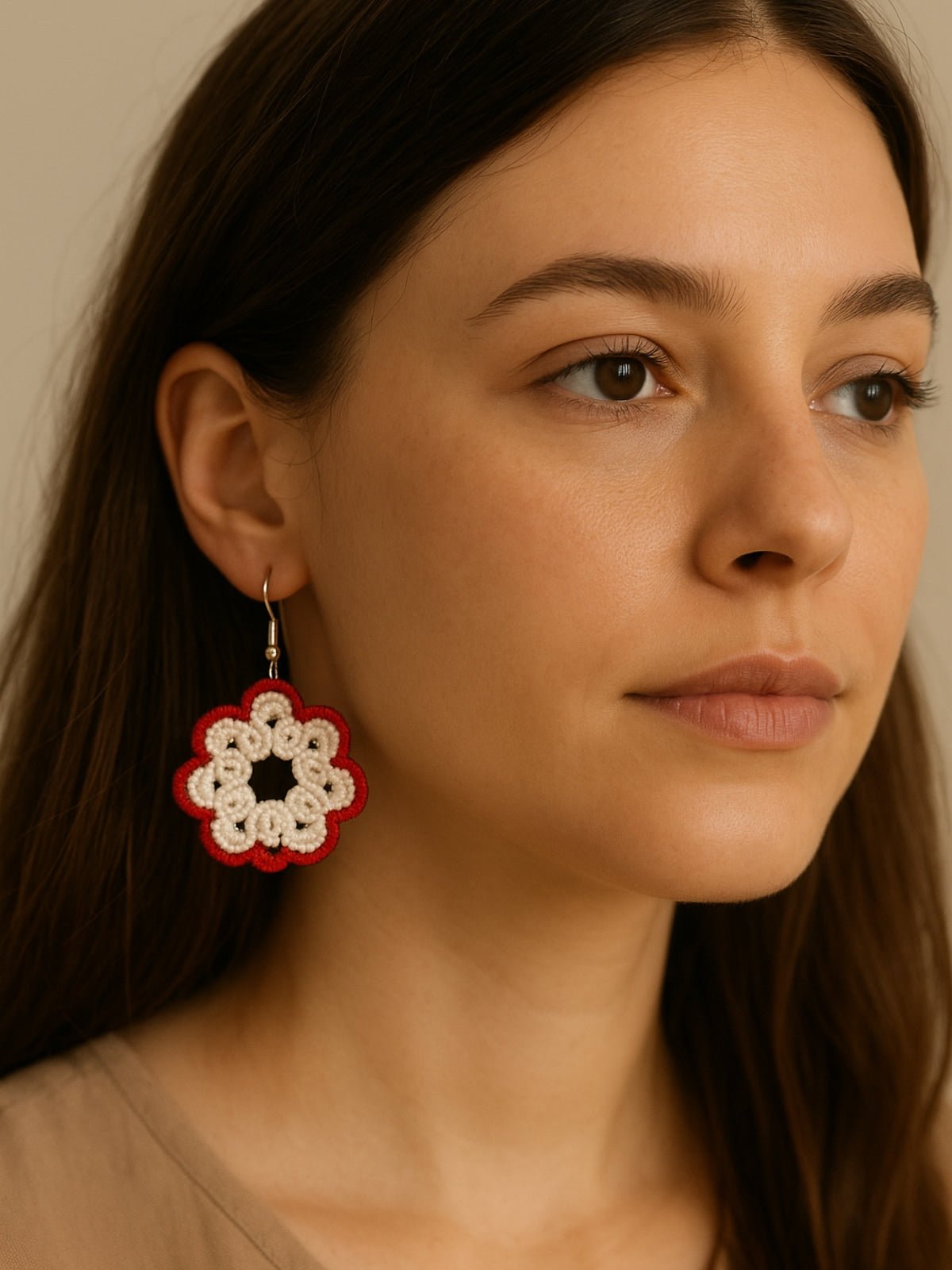 Beautifully crafted with cotton thread using the age-old technique of tatting, these earrings feature intricate lacework created stitch by stitch with shuttle tatting. Handmade with great care, each pair is exclusively crafted using this traditional method. These super cool, extremely lightweight earrings are versatile enough to complement any attire, ensuring you can wear them all day with ease. As artisanal items entirely made and decorated by hand, small imperfections denote the originality of the product. So, hop on board and add a touch of artisanal charm to your ensemble!