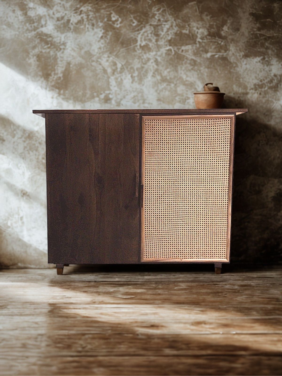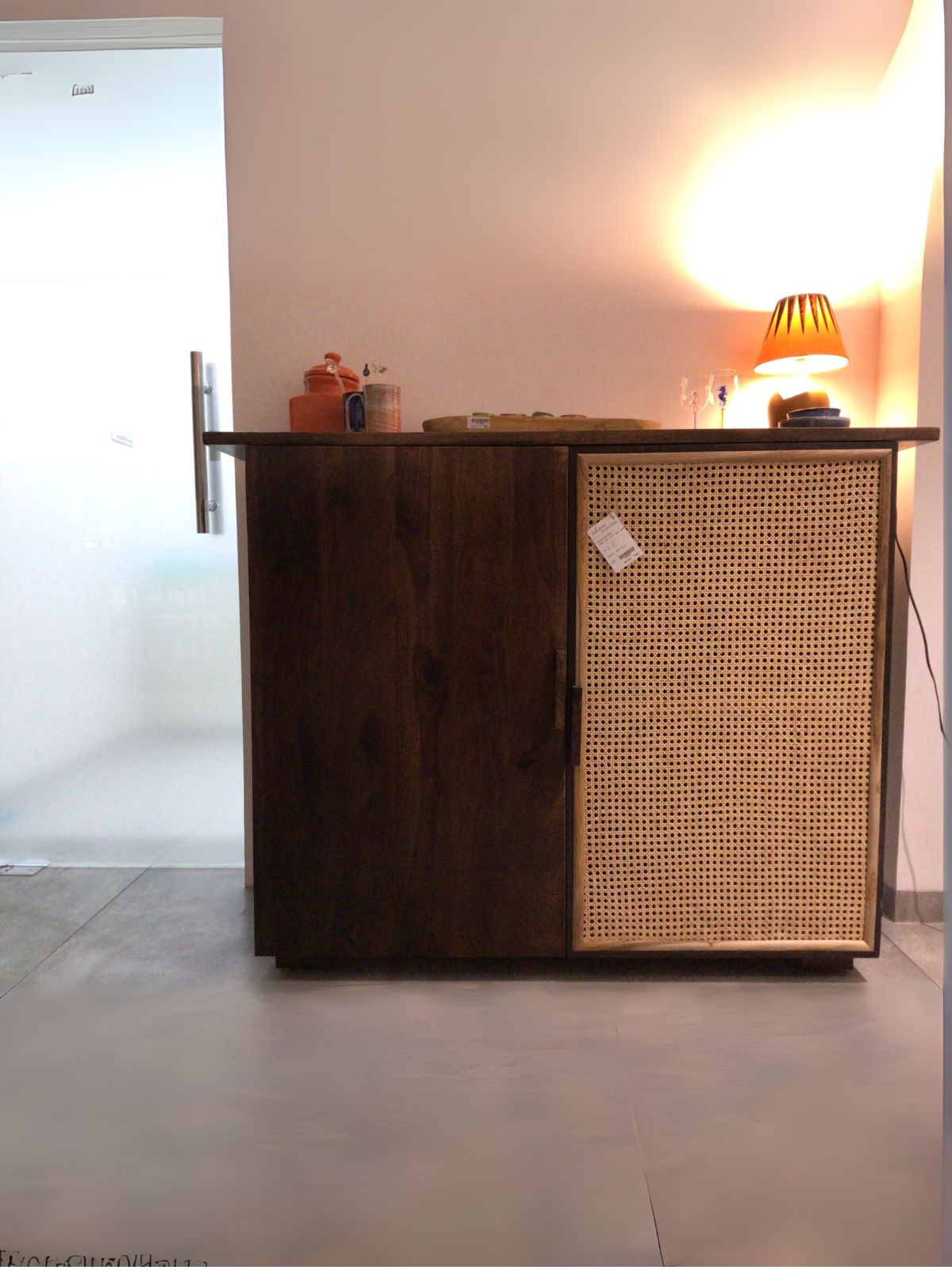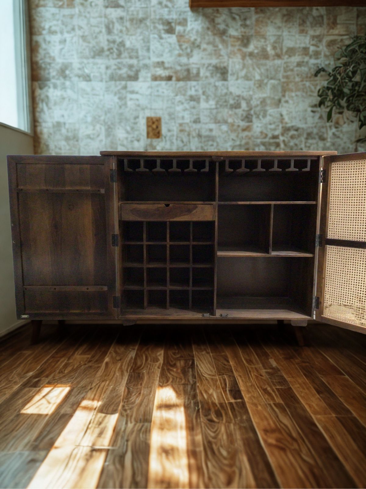 A refined bar unit crafted in solid wood, featuring dual shutters in cane and timber for a striking contrast. Inside, well-planned racks and shelves keep your bar essentials organized. A true blend of craftsmanship and character, perfect for elegant entertaining.