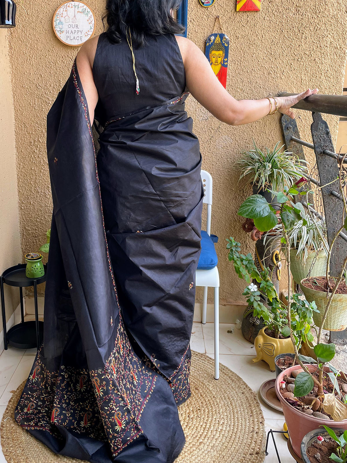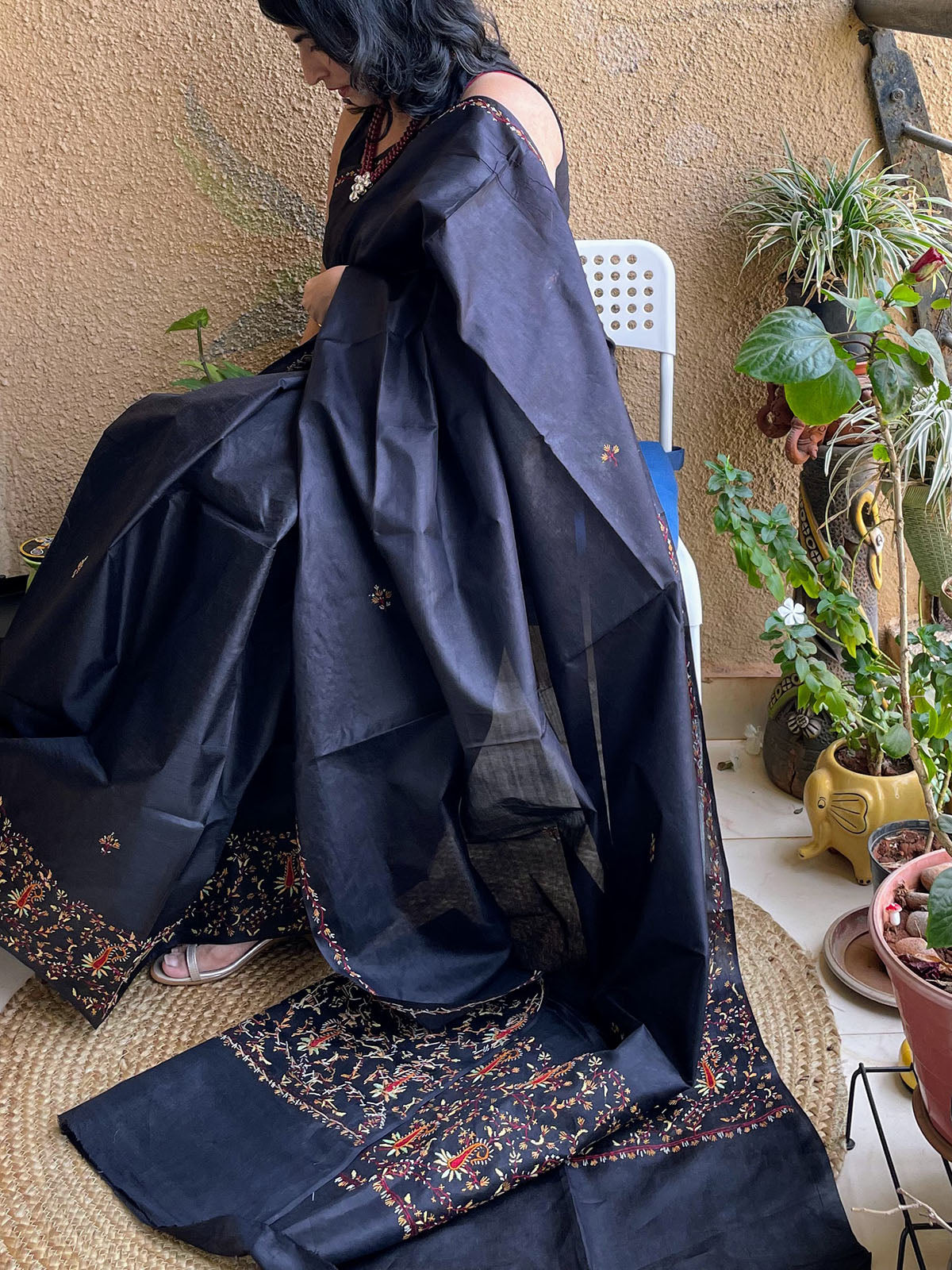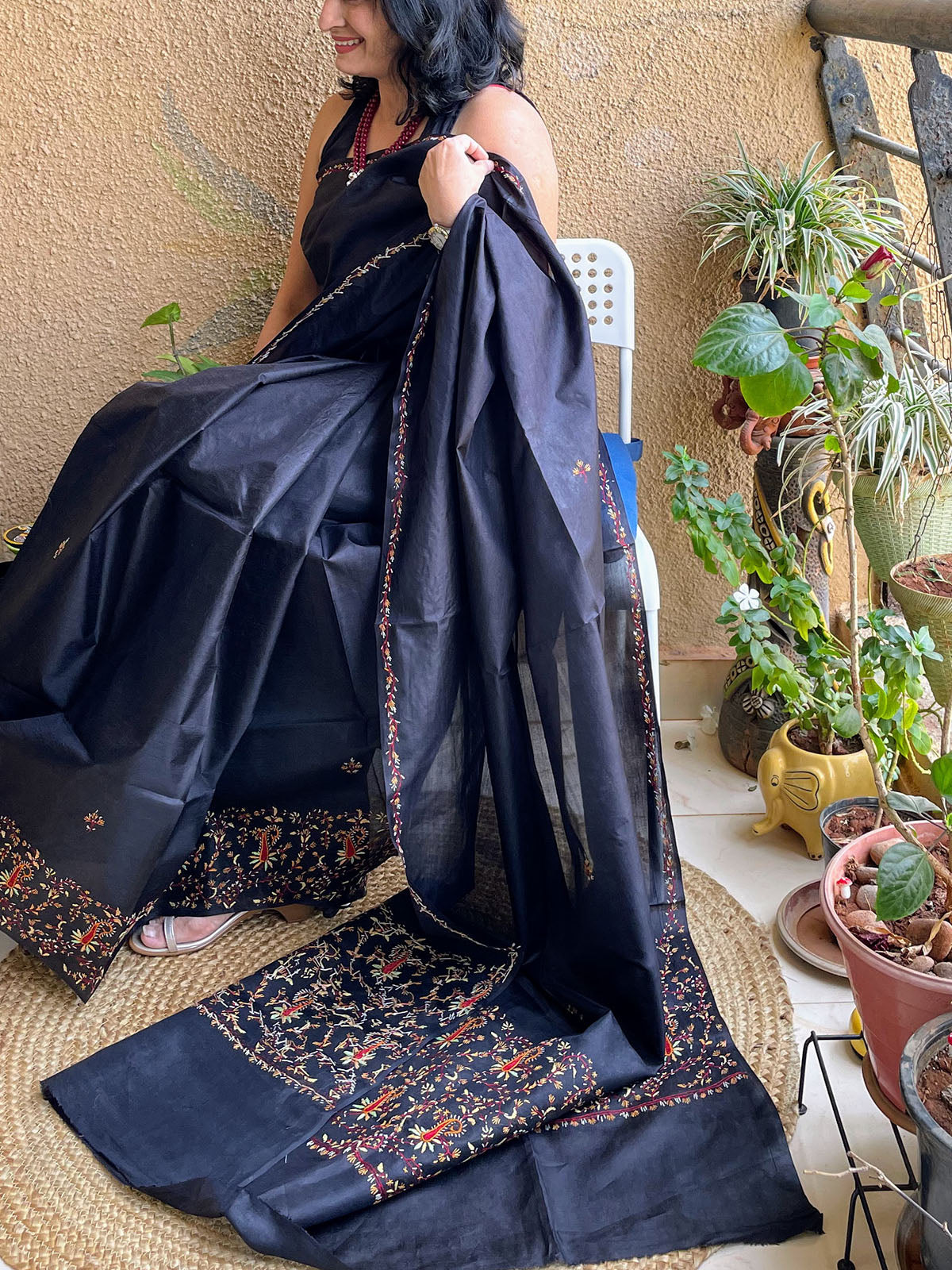 A very delicate embroidery work from Kashmir, the Sozni embroidery that’s very popularly seen on Pashmina Shawals. We have taken inspiration and transformed it on Sarees . Each saree takes around 3 months to make. Only one artisan in involved in making the saree.
