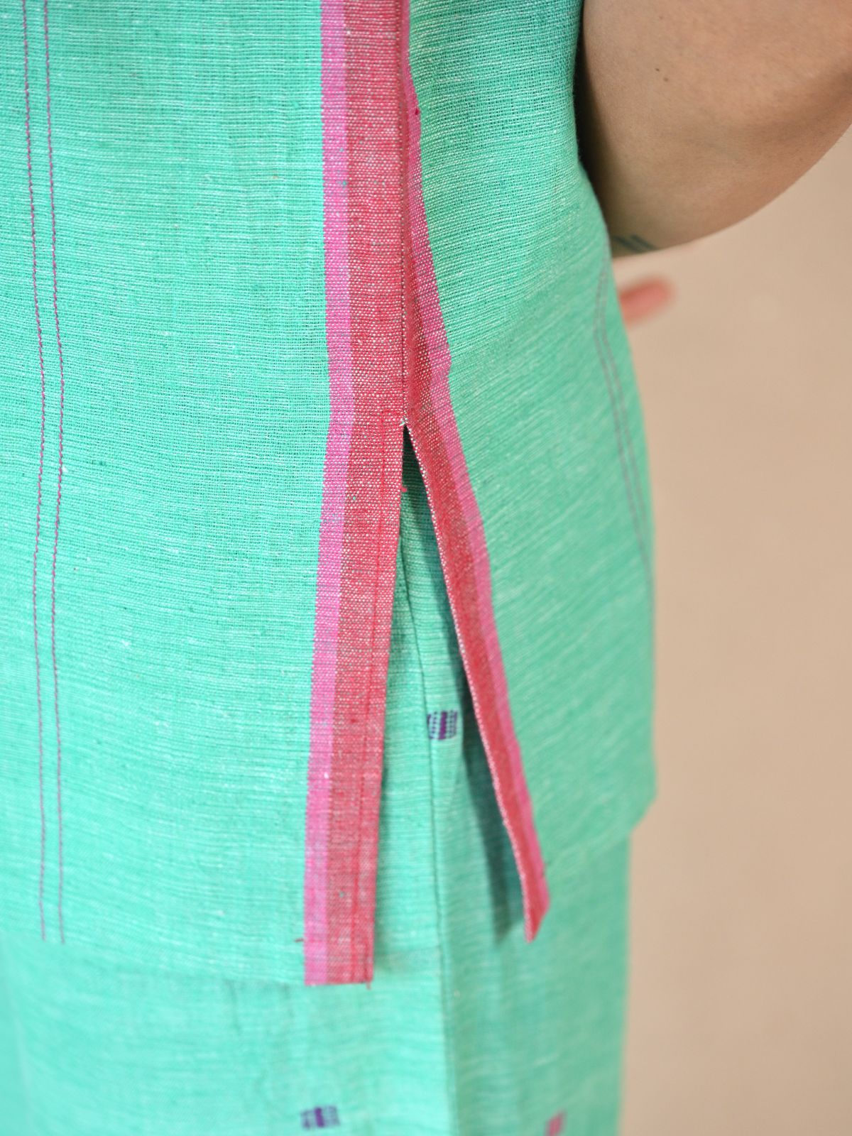Embrace grace with the straight cut tunic, designed with colored side hem. Made from organic handwoven Kala cotton, this tunic is adorned with intricate hand embroidery. The green butti color offers a timeless and elegant look, while the comfortable fit ensures ease of wear. Perfect for any occasion, this piece beautifully merges casual craftsmanship with modern style.