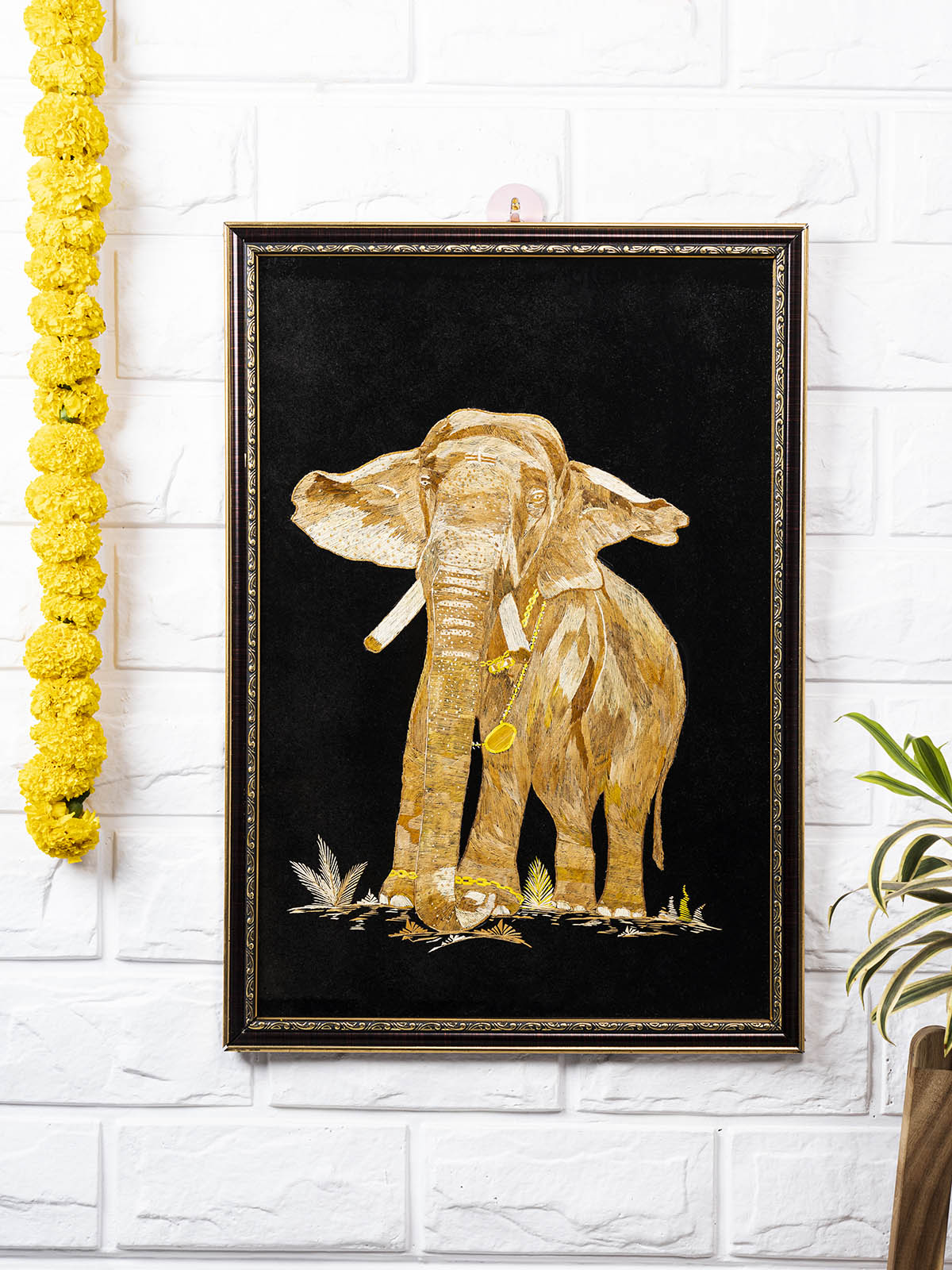 Discover the beauty of Rice Straw Painting, a centuries-old art form from Kerala, with our stunning elephant sculpture. This majestic piece showcases the intricate craftsmanship involved in creating sculptures from various shades of rice straw, a unique medium that adds depth and texture. Each straw is meticulously cut and thoughtfully arranged on a sleek black canvas, highlighting the elegance and grace of the elephant—a symbol of strength and wisdom in Indian culture.