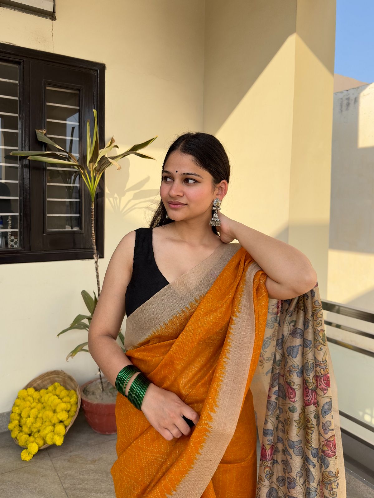Discover the refined elegance of this Sunehra Safar saree, where traditional Kalamkari artistry meets contemporary style. Crafted from premium cotton in a warm mustard hue, this piece showcases meticulously hand-printed floral patterns across the body, complemented by an ornate Kalamkari pallu. The sophisticated border work adds depth and dimension, making it an ideal choice for both festive occasions and refined everyday wear. A testament to timeless craftsmanship and understated luxury.