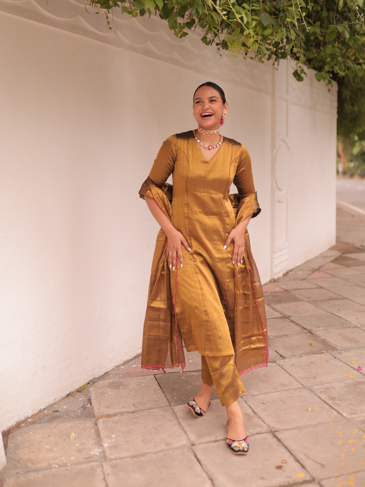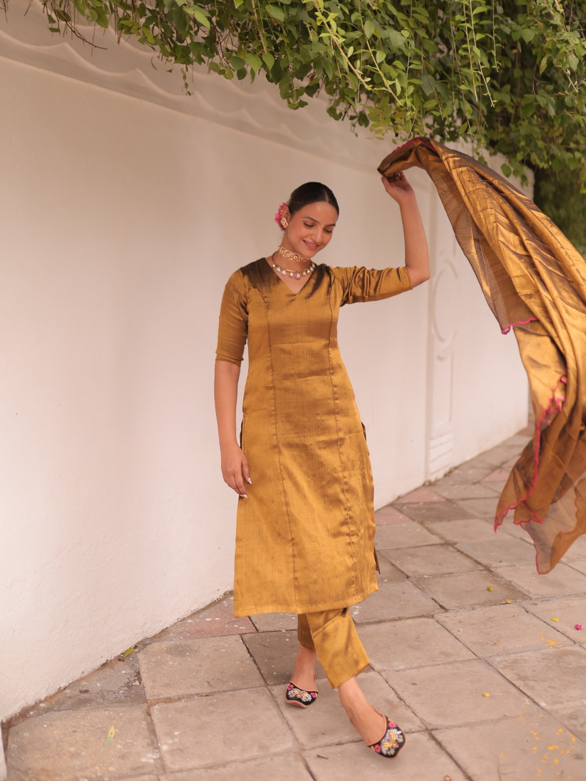 Crafted in handwoven tissue fabric, this golden kurta set embodies understated elegance. The kurta features a refined V-neckline with piping along the princess line, elbow sleeves, and delicate hand hemming at the neck and cuffs. Lined with soft, breathable fabric and detailed with two inseam pockets and a invisible back zipper, it balances comfort with sophistication. The coordinated pants come with a chic split hem, a functional side pocket, and a secure hook-and-zip closure. Completing the ensemble is a golden handwoven tissue dupatta, finished with a graceful rani pink scalloped border — a timeless addition that enhances the set’s festive appeal.