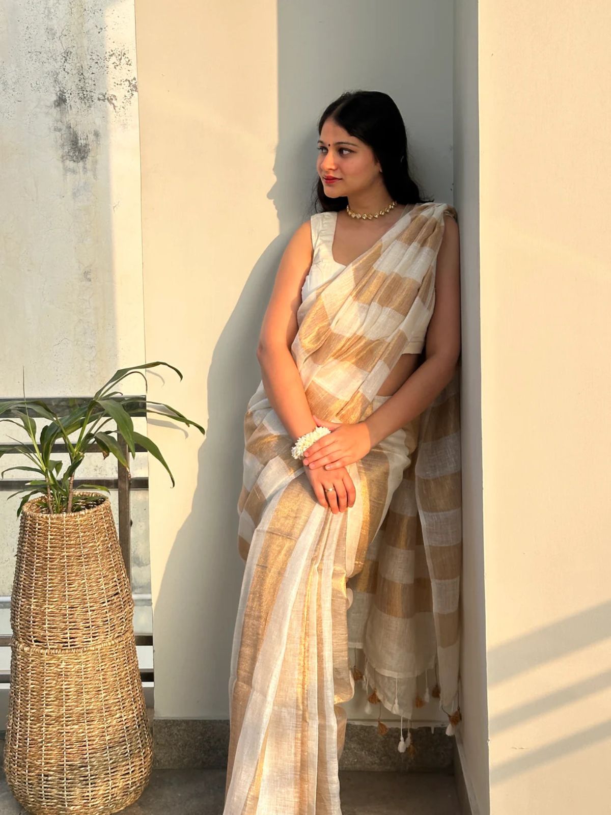 There’s something effortlessly graceful about this ivory and gold linen saree. Woven with soft, breathable linen and a touch of shimmer, it captures the beauty of minimalism in every fold. The subtle gold stripes lend it a soft charm without taking away from its understated elegance. Whether you’re attending a day event, a puja, or simply want to embrace slow fashion, this saree adds warmth and poise to every moment - just like sunlight on a quiet morning.