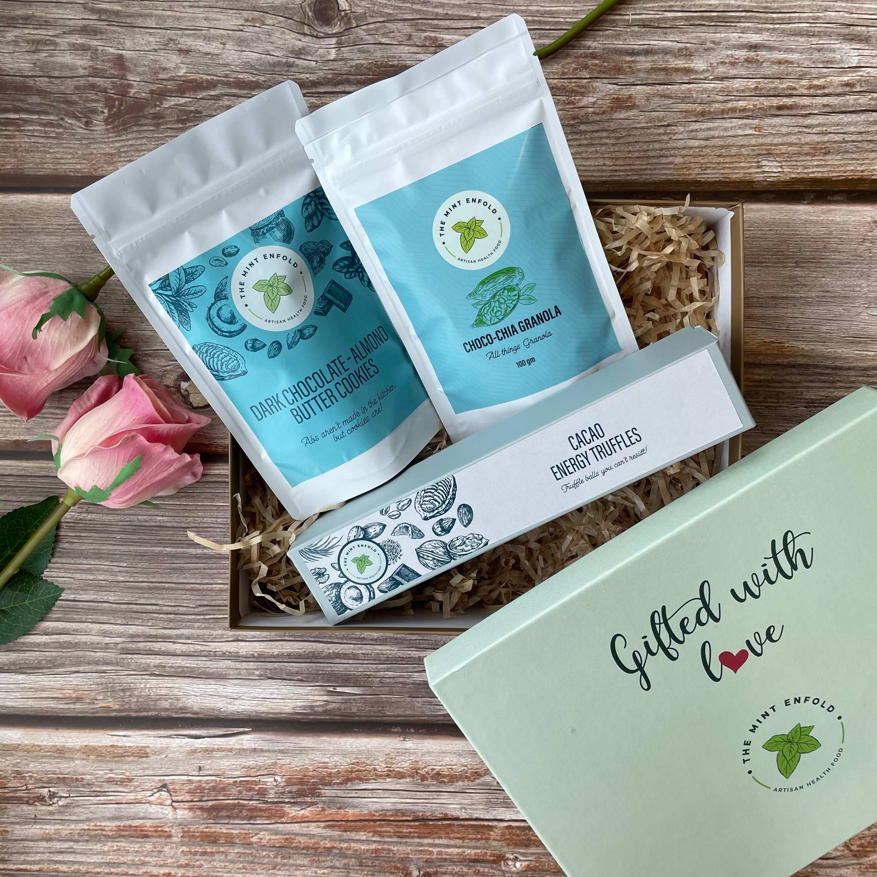 Discover this sweet treat choclate hamper which offers one pack of three Dark Chocolate-Almond Butter Cookies, one pack of 100g Choco-Chia Granola, and one box of Cacao Energy Truffles.