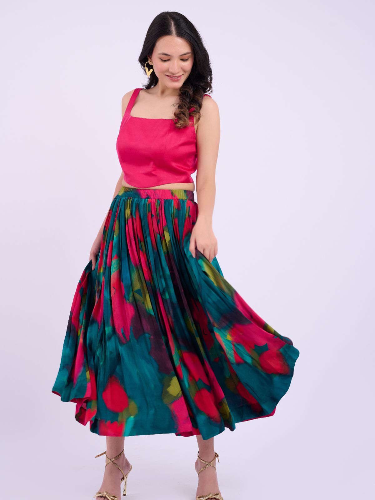Bring movement and magic to your wardrobe with the Tara Skirt – a vibrant, flowy piece that’s equal parts elegance and play. Made in lightweight cotton satin, this full-volume skirt features abstract hand-painted florals in shades of jade green, fuchsia, and golden olive. The gathered waistband offers a comfortable fit, while the luxe finish makes it perfect for both festive moments and resort-ready looks.