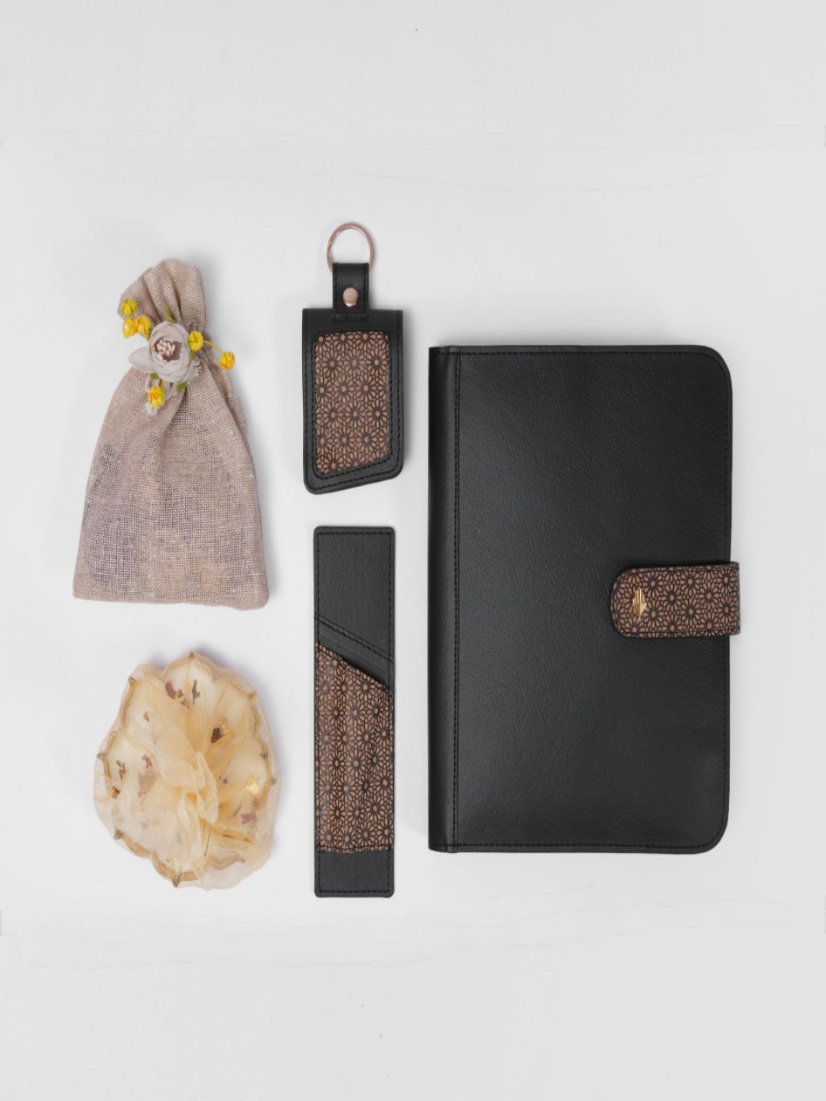 Presenting our plant-leather luxury corporate stationery gift set, a perfect blend of sophistication and sustainability. This elegant collection includes a sleek Diary Folder, Utility Pouch, Book with a pen Holder and Keychain, all crafted from eco-friendly materials. Ideal for impressing clients or enhancing your office environment, this gift set reflects a commitment to quality and environmental consciousness. Elevate your work game with this thoughtful and stylish choice!