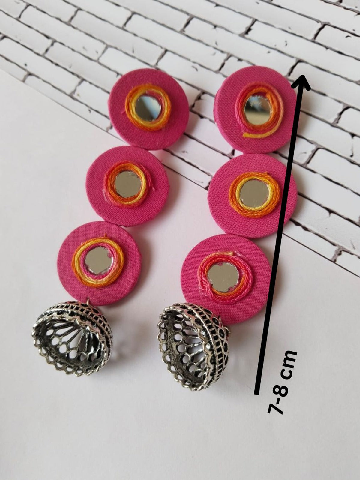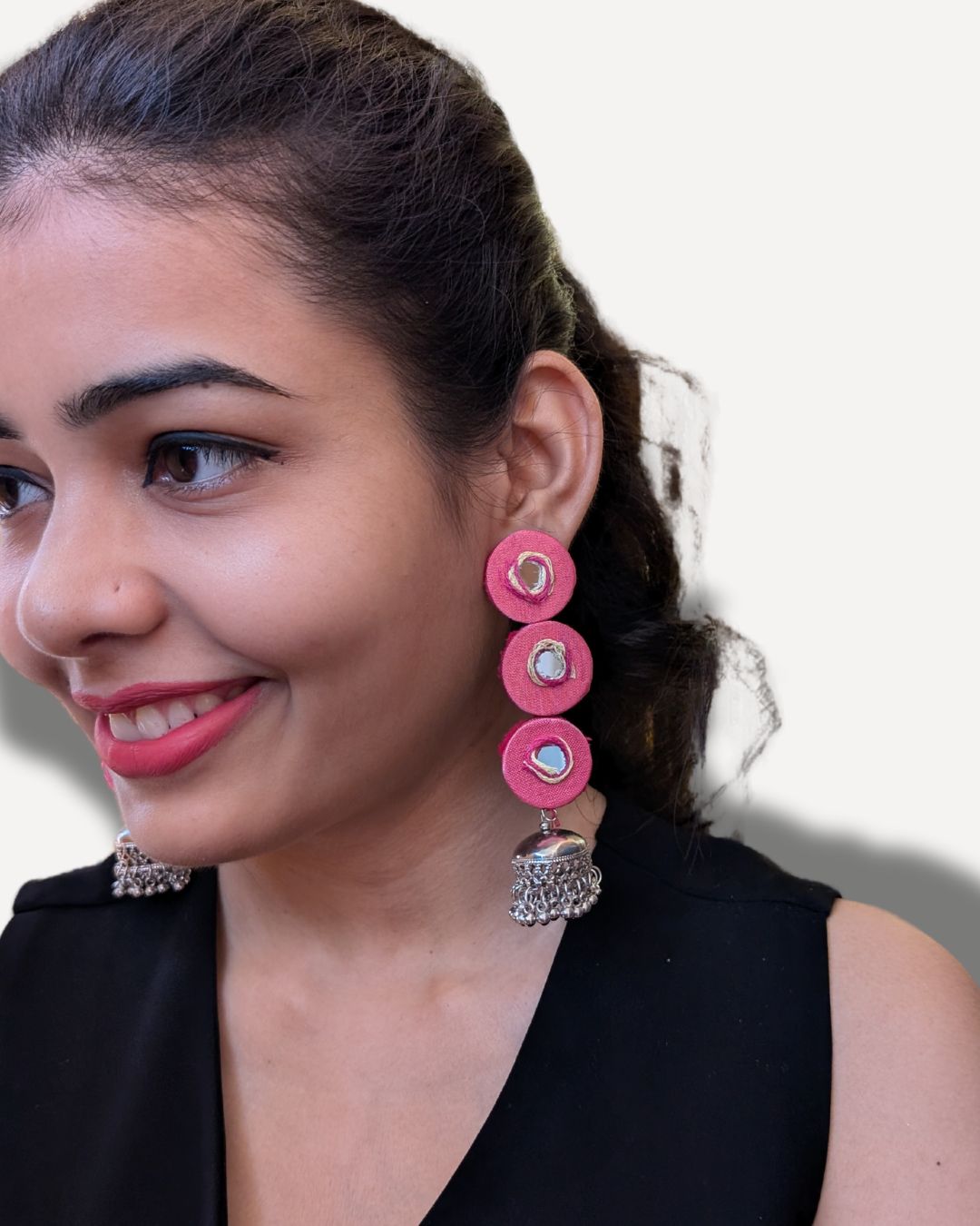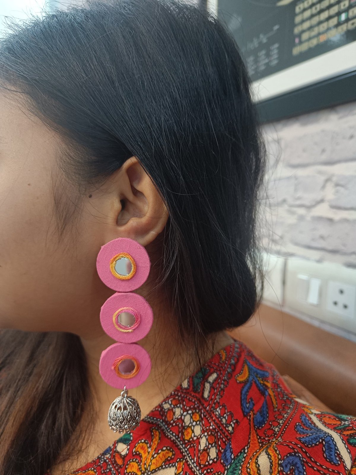 Bursting with personality, these long earrings feature three cascading drops of pink mirror fabric. Their round silhouette and layered design make them a standout piece for festive and party occasions. Lightweight and expressive, they’re made from high-quality fabric and mirror, offering a balance of whimsy and elegance. Wear them to add movement and sparkle to your outfit. To preserve their vibrancy, avoid moisture and store them in an airtight container.