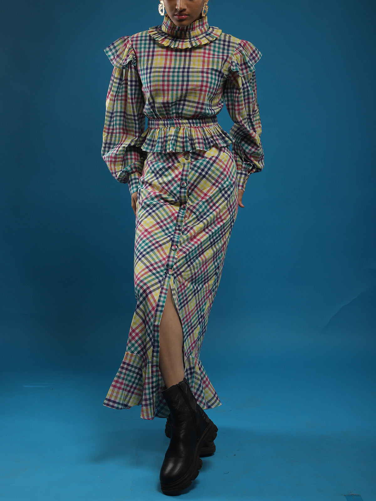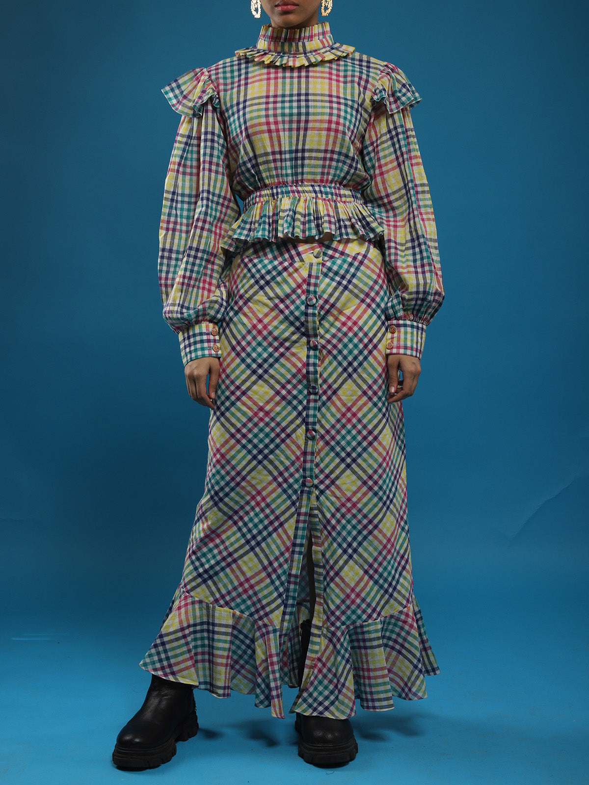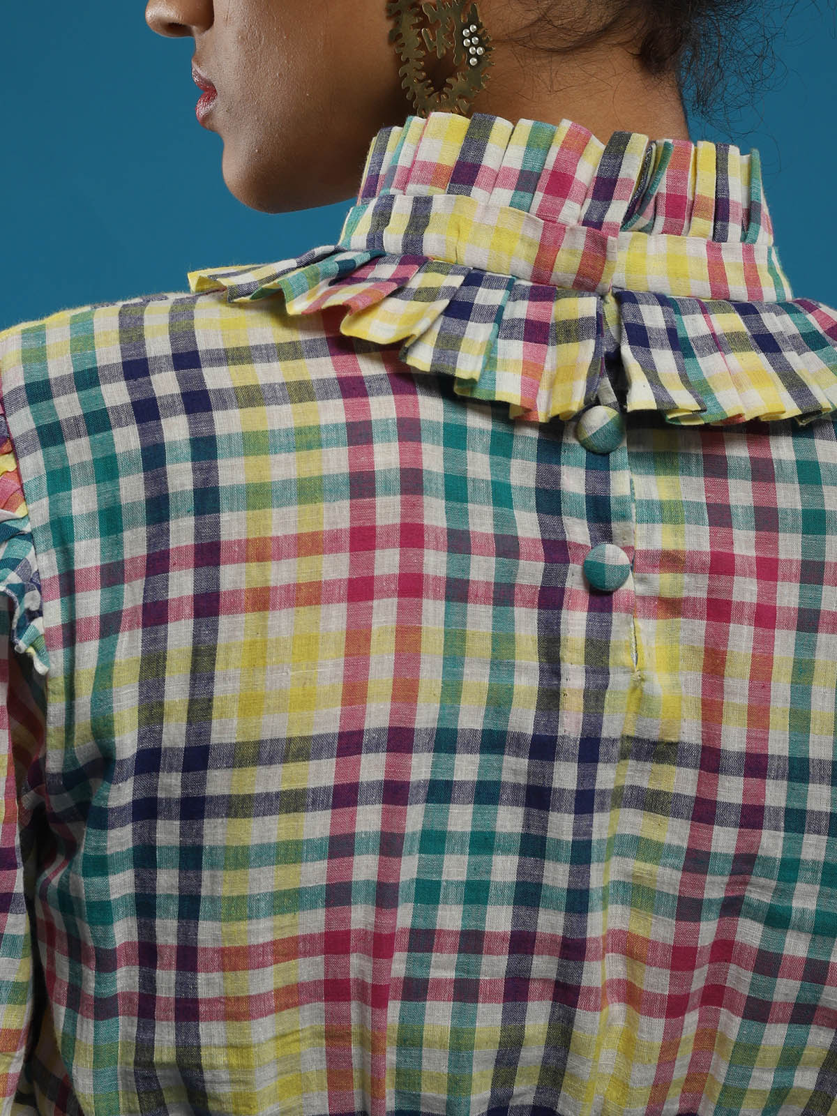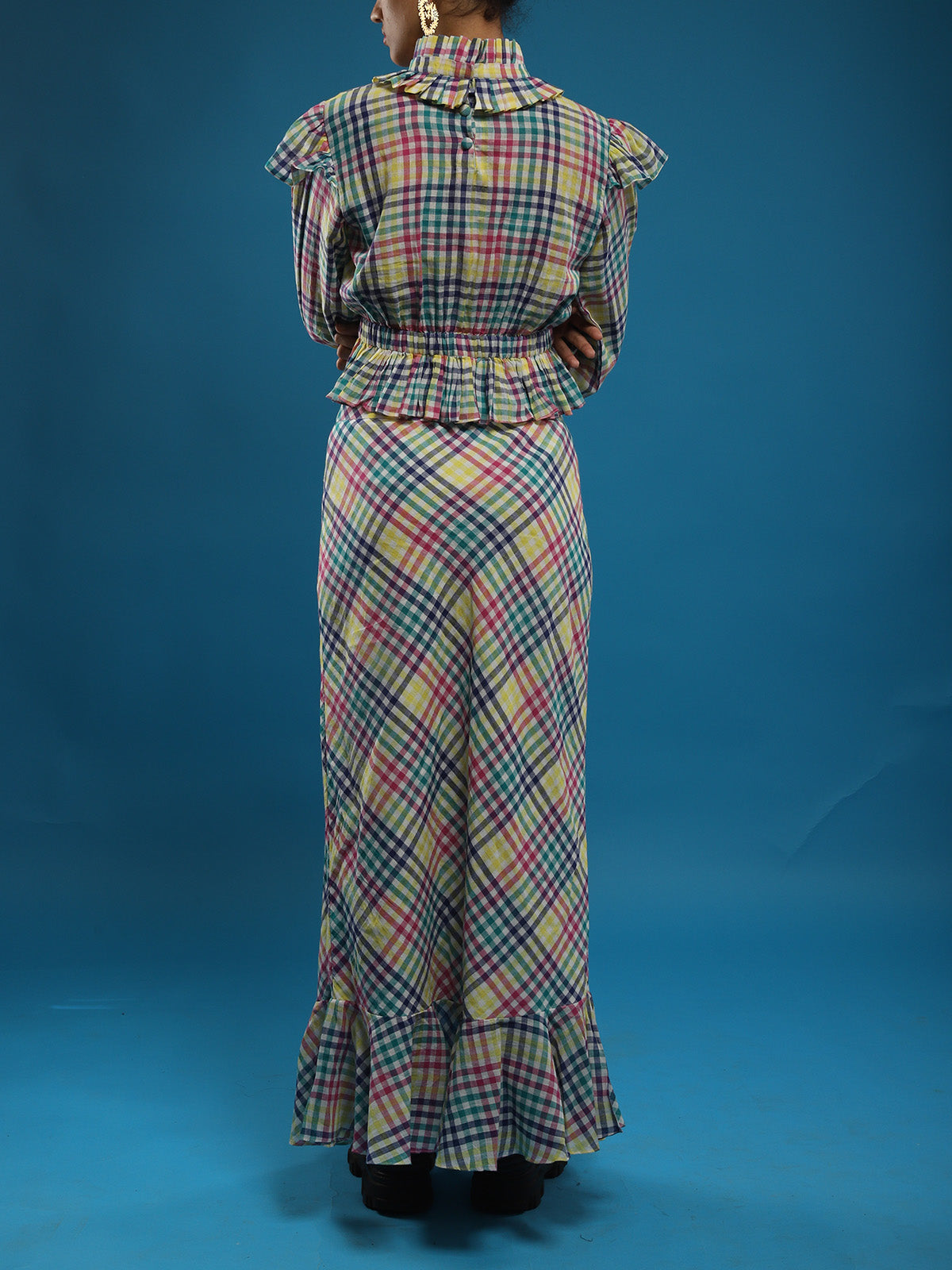 The top is featuring knife pleated neck, full sleeve with shoulder detailing, elastic & gathering at waist, back opening. Length is 19". Height of model is 5'7" wearing size S. Made in hand woven 100% cotton fabric. skirt sold separately. First wash drywash and then followed by hand wash in cold water separately with mild detergent. please note that item cant be returnable, however can be exchanged for a size up or down