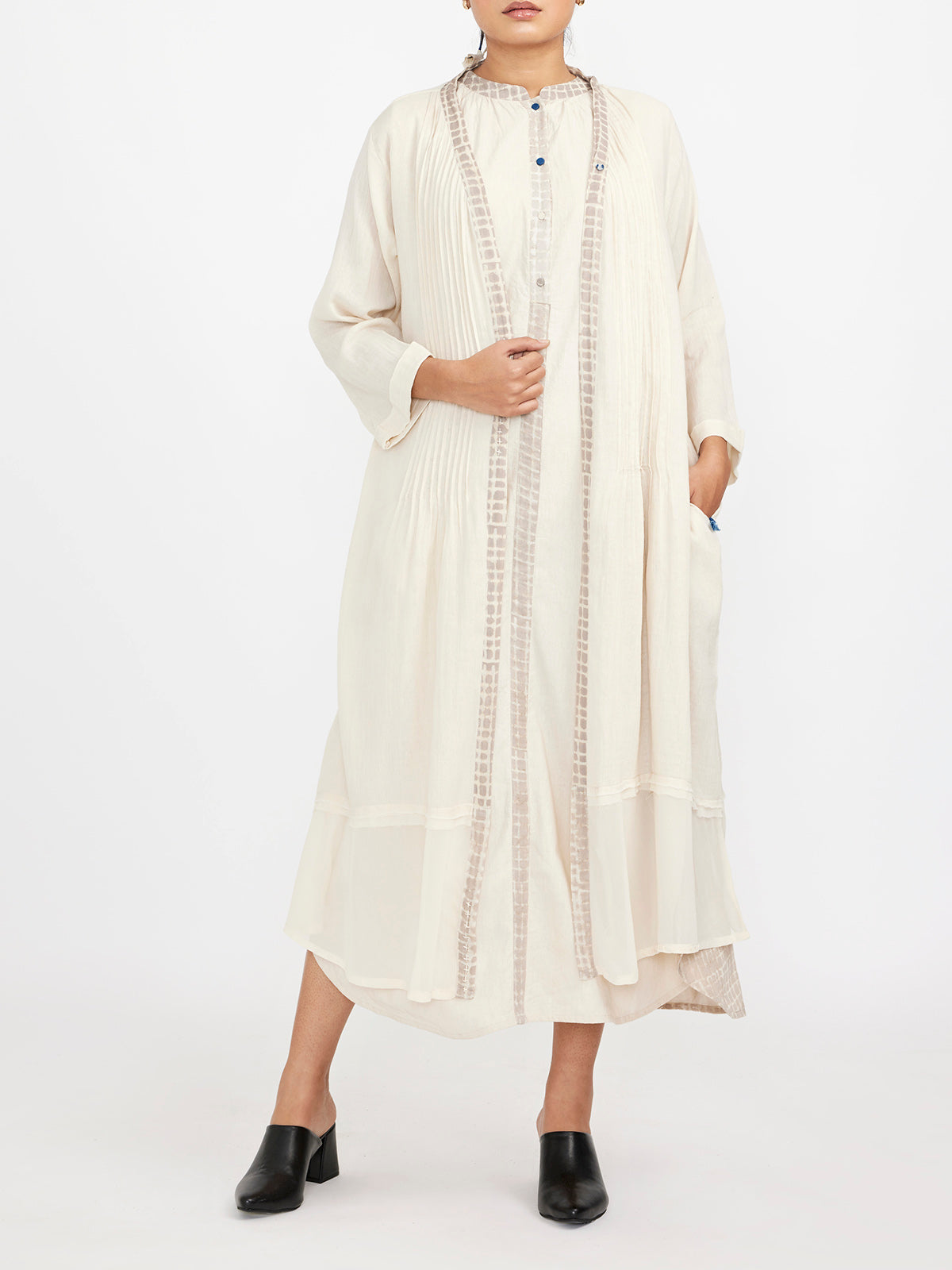 Two piece dress set with solid button down sleeveless dress with lining paired with block printed fine double cotton robe with pin tucks inf front &chiffon hem .The two piece set comes with a belt for fitted look.The set features JG signature button knot details .
