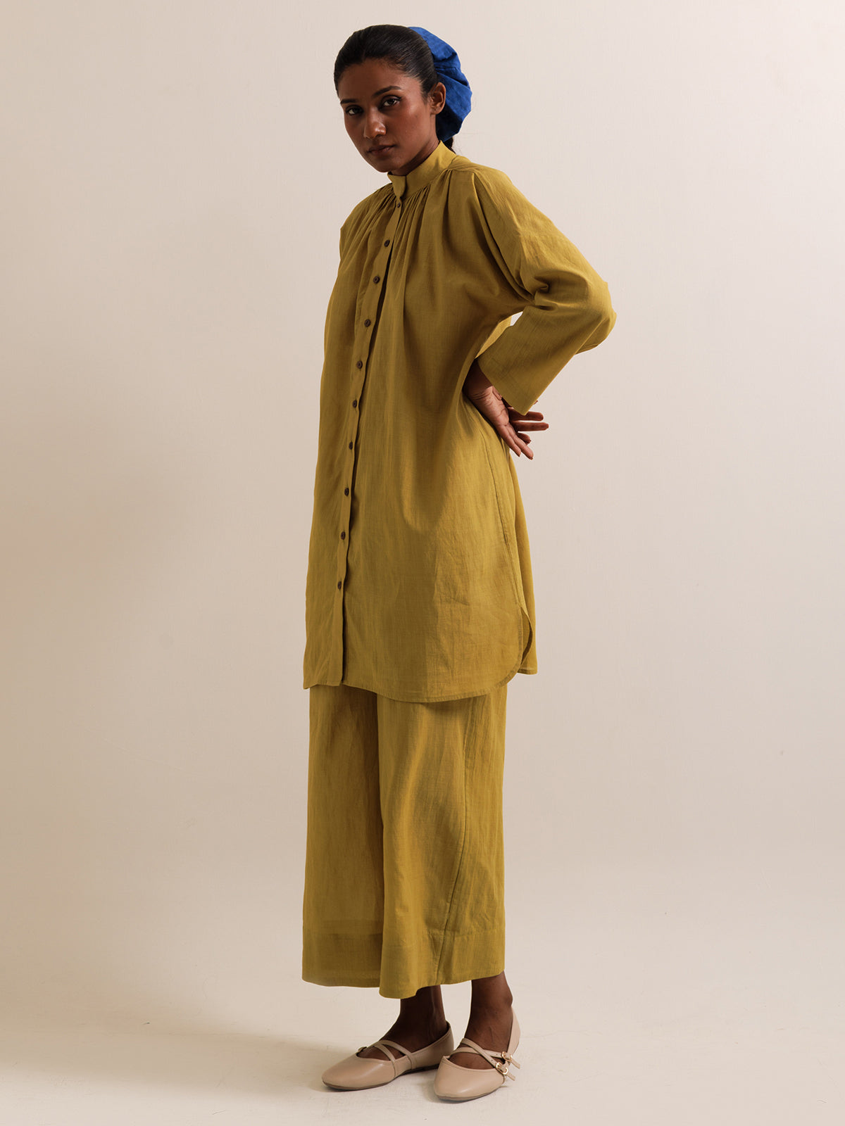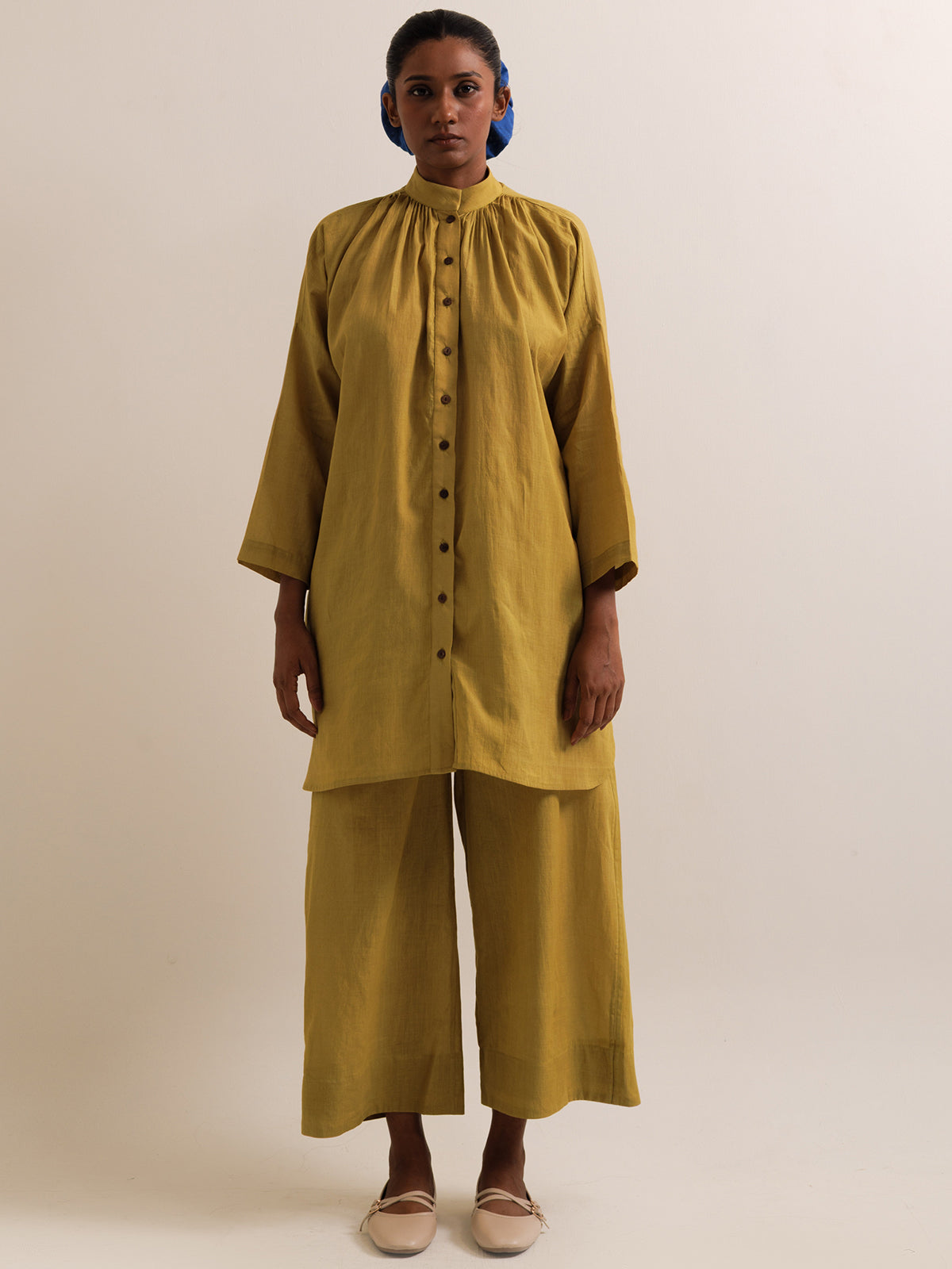 Vahini kurta set made in handwoven bengal cotton, kurta featuring stand collar, front button opening, down armhole cut and soft gathers at neckline. Wide legged trousers with pockets, both finished with fagoting side seamlines.