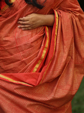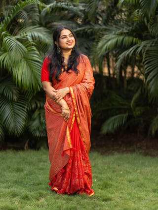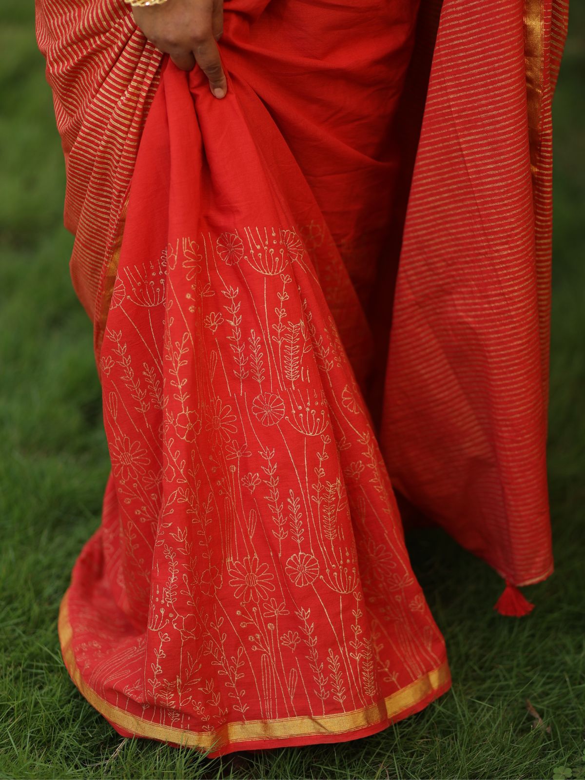 Celebrate timeless elegance with our Vaidehi saree, crafted from soft and breathable mul cotton, perfect for any season. This radiant red saree showcases a harmonious blend of minimalism and tradition, featuring subtle golden stripes adorning the top half, and intricate hand-block-printed floral motifs gracing the bottom half. The golden zari border adds a touch of opulence, making it an ideal choice for festive occasions or cultural gatherings.