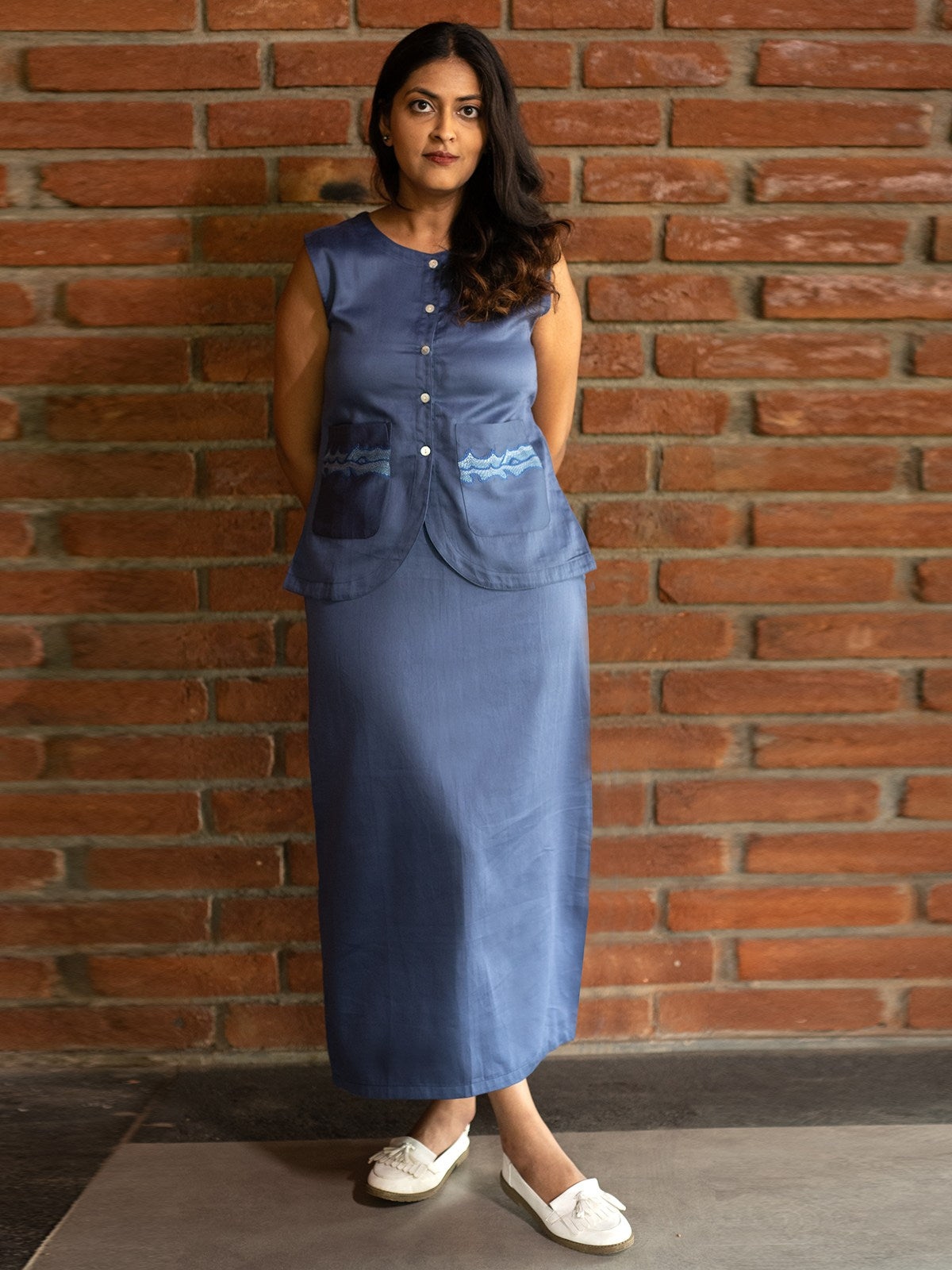 A sleeveless buttondown vest paired with a long column skirt, evoking effortless 1970s sophistication. The structured vest with a curved hemline contrasts elegantly with the easyflowing skirt. Side and back slits on both the vest and skirt allow for movement while maintaining a polished look. The vest features subtle, wavelike embroidery on the pockets, adding a touch of artisanal charm inspired from the elements of nature. Crafted from 100% cotton with a rich, dusky blue hue that drapes beautifully and can be worn as a set for a statement look or styled separately for endless outfit possibilities.