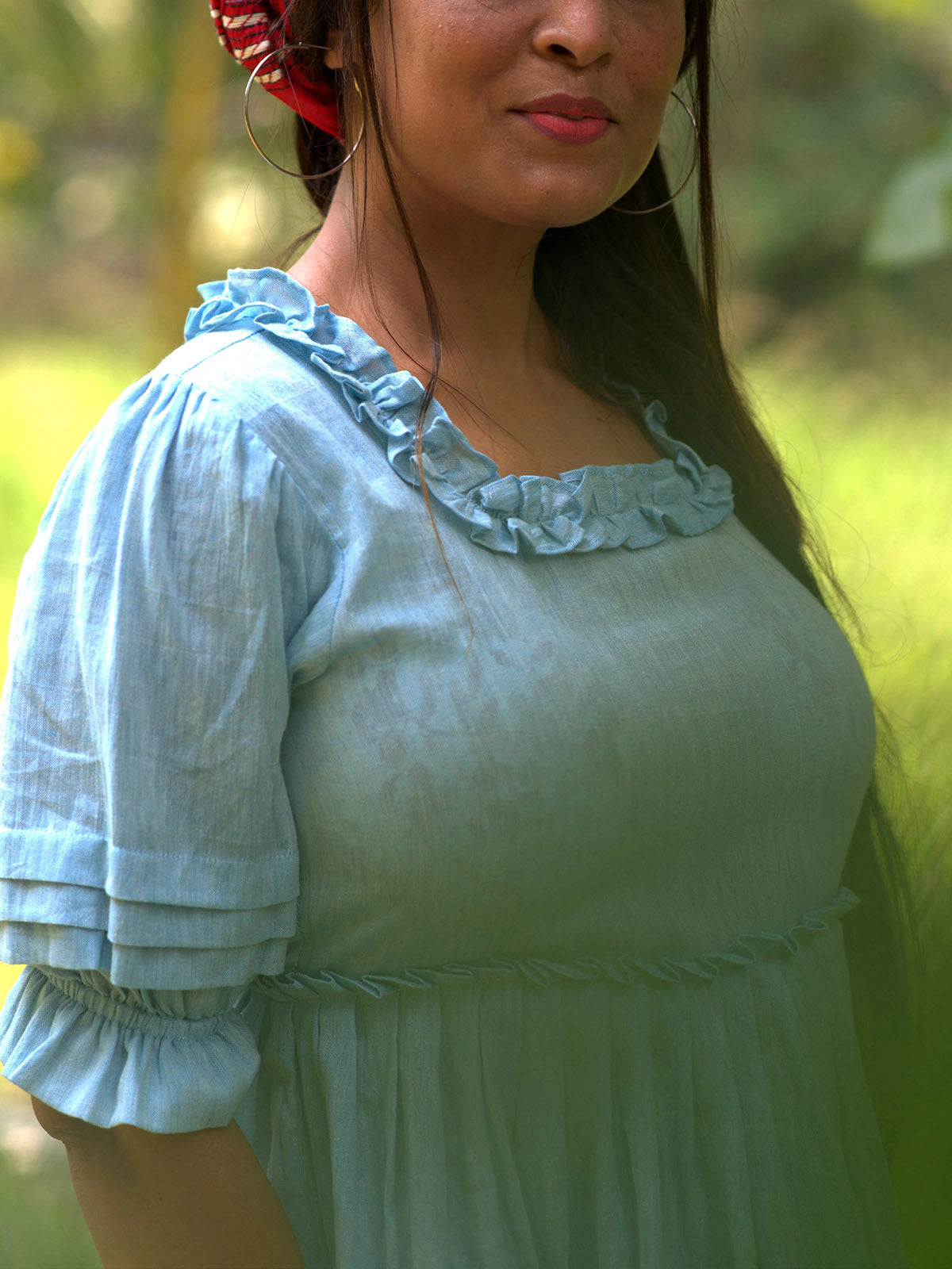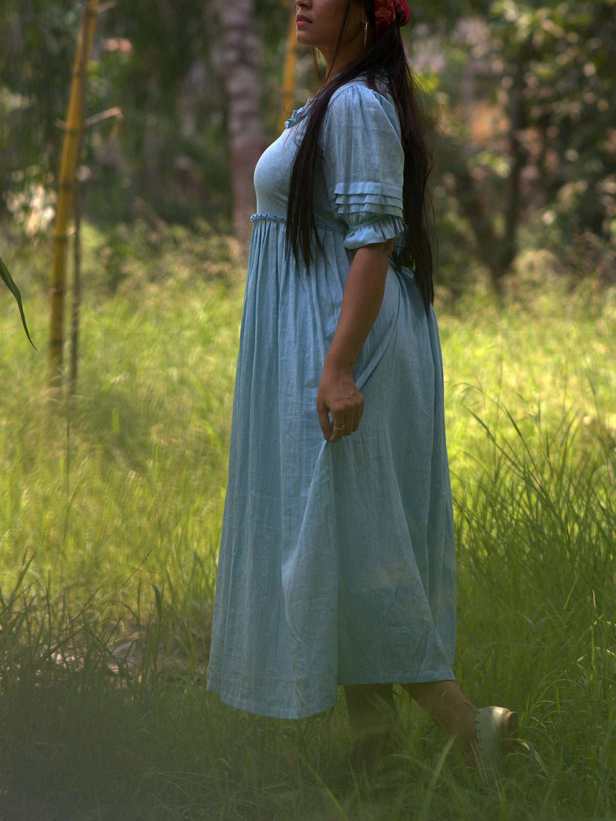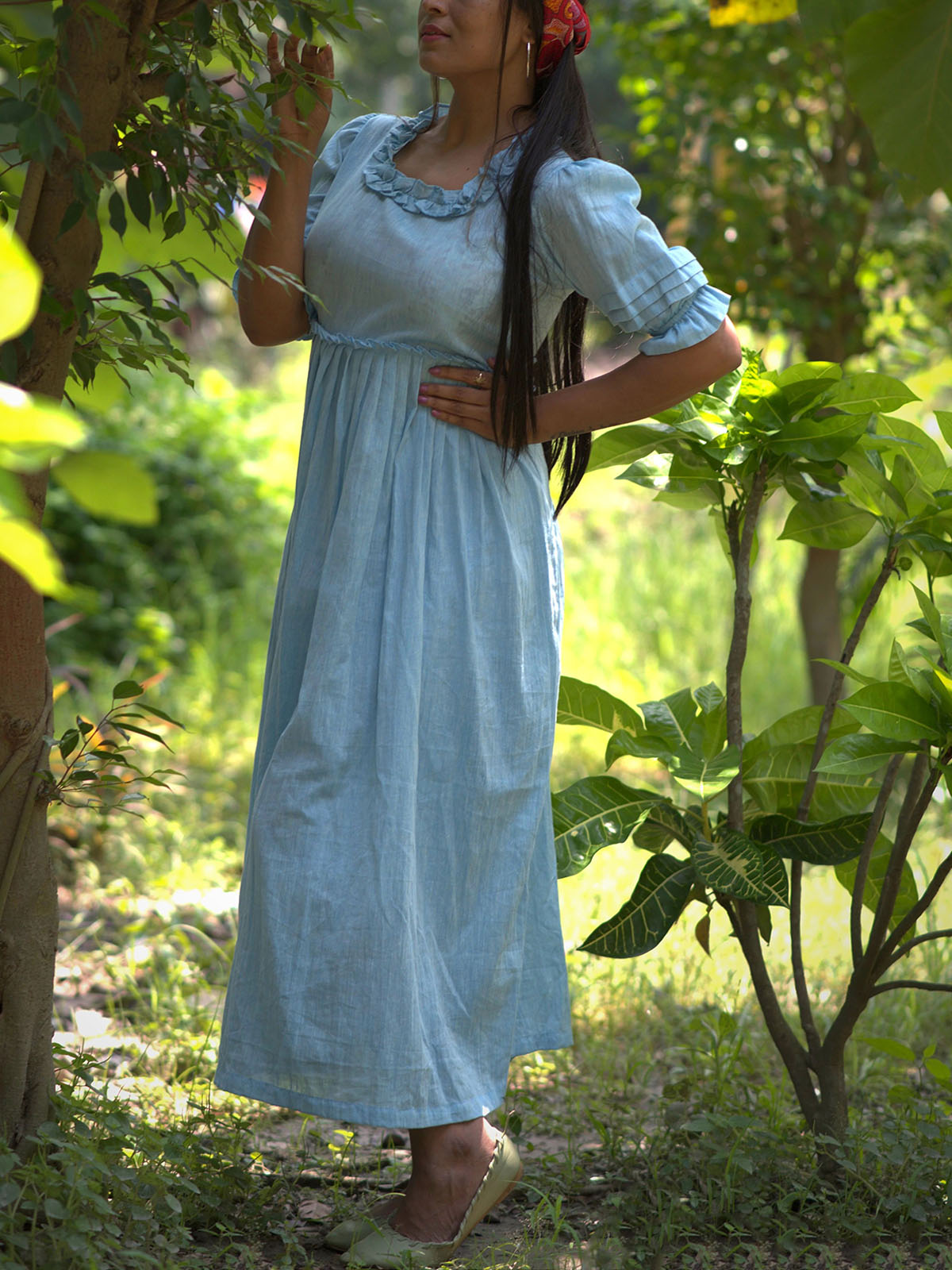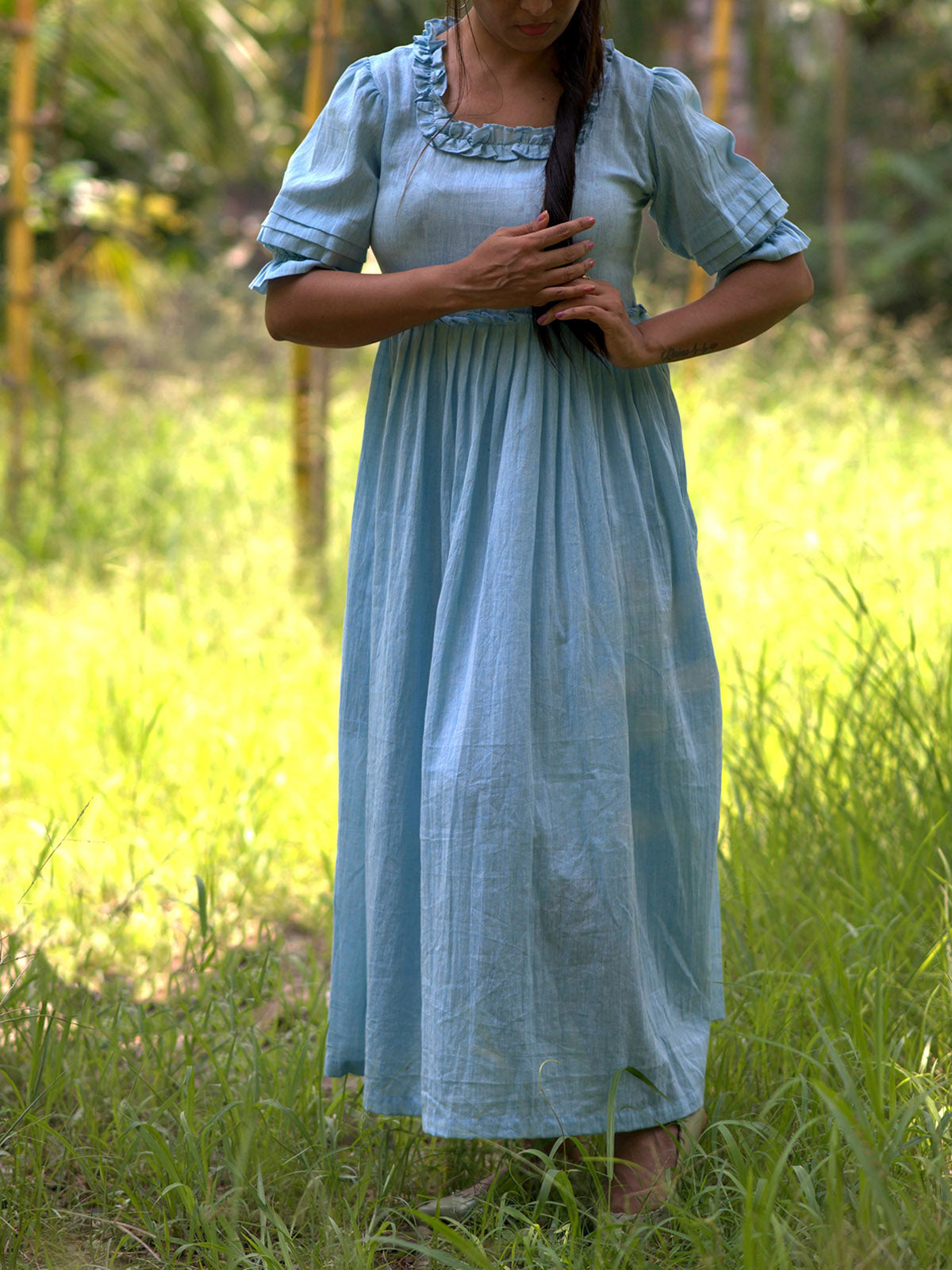 Embrace summer elegance with the Victorian Masquerade Dress in Blue. This handmade pintuck linen/cotton maxi dress offers relaxed comfort with pleated puff sleeves and a skin-friendly plaited/knots front. Perfect for evening cocktail parties, its empire waist and hand-pintuck detailing add a romantic touch. Ruffle accents on sleeves and collar evoke the timeless grace of the Victorian era.
