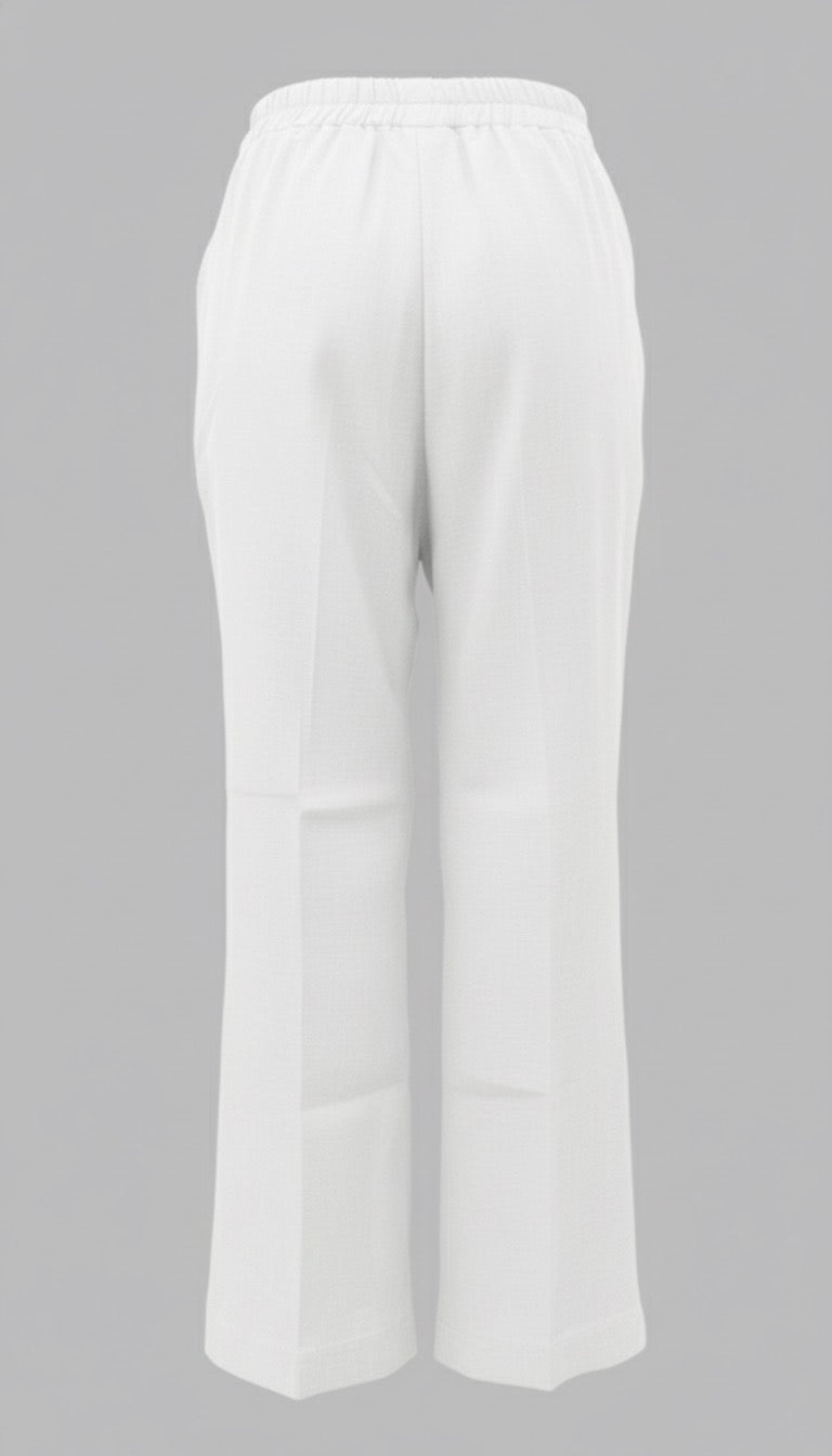 Crafted from crisp 100% cotton, these essential trousers feature a pristine white hue. They offer a flattering straight-leg fit that ends at an ankle-grazing crop. The clean, high-rise waist and smooth silhouette create a sophisticated foundation, making them a versatile piece that pairs seamlessly with any top for a polished, fresh look.