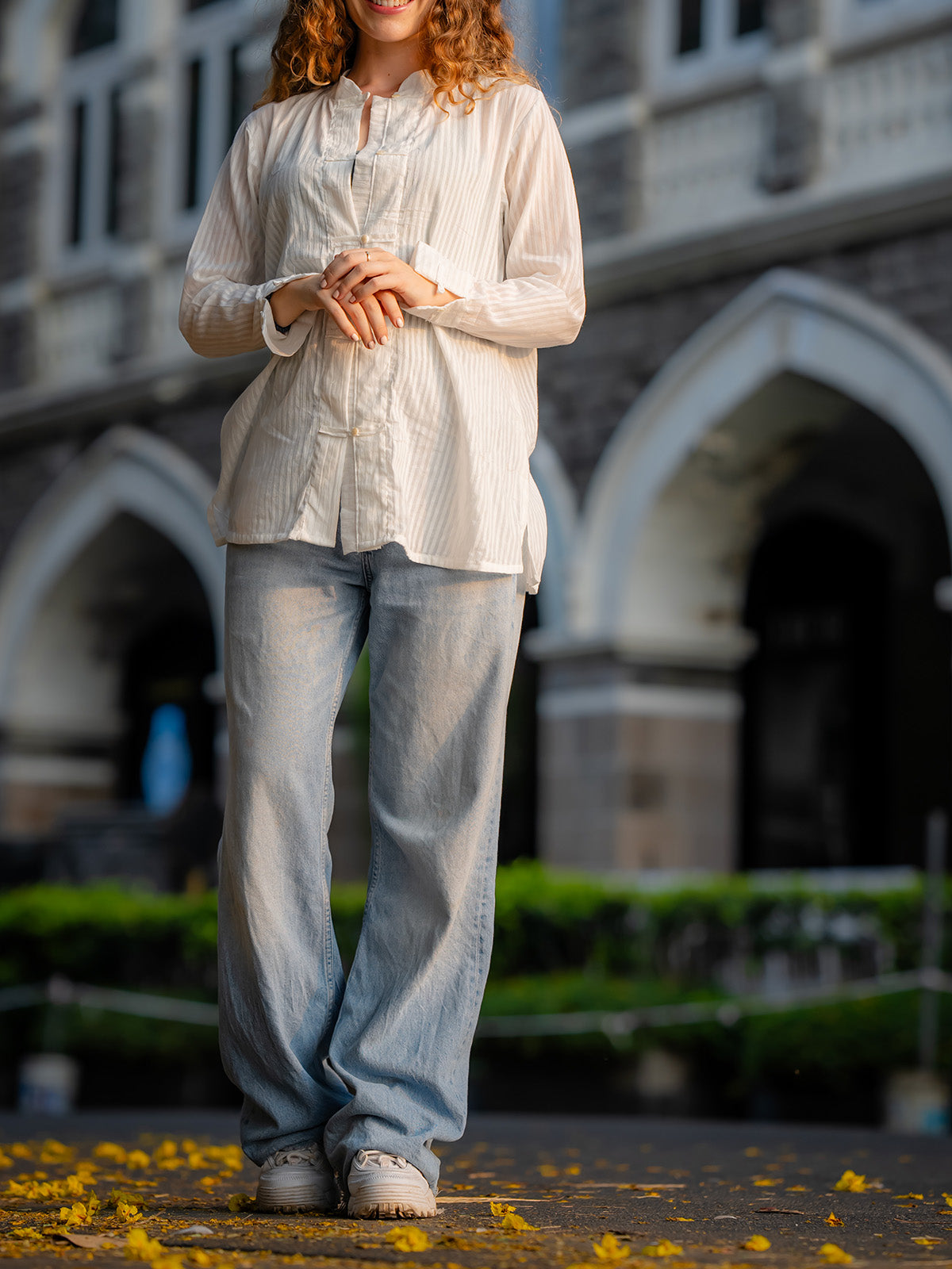 Introducing the White Street Shirt, a timeless piece that exudes sophistication. Crafted from premium fabric, it offers a relaxed fit and features a classic round neckline with long sleeves. The shirt is adorned with intricate lace detailing and subtle front pleating, adding a refined touch. Finished with adjustable buttoned cuffs, this versatile shirt is perfect for any occasion, blending comfort with chic style.