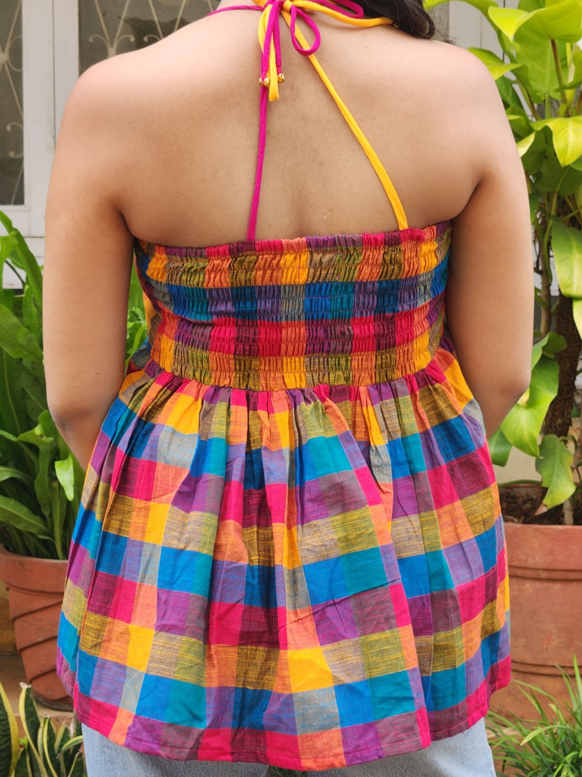 A cropped tube top in sun-bright Madras checks with a comfortable smocked back for secure stretch. Colourful shoulder ties finished with ghungroo accents add playful movement and adjustability. Style it with high-waist skirts, denims, or co-ords for a light, festive look that balances craft, ease, and contemporary flair.