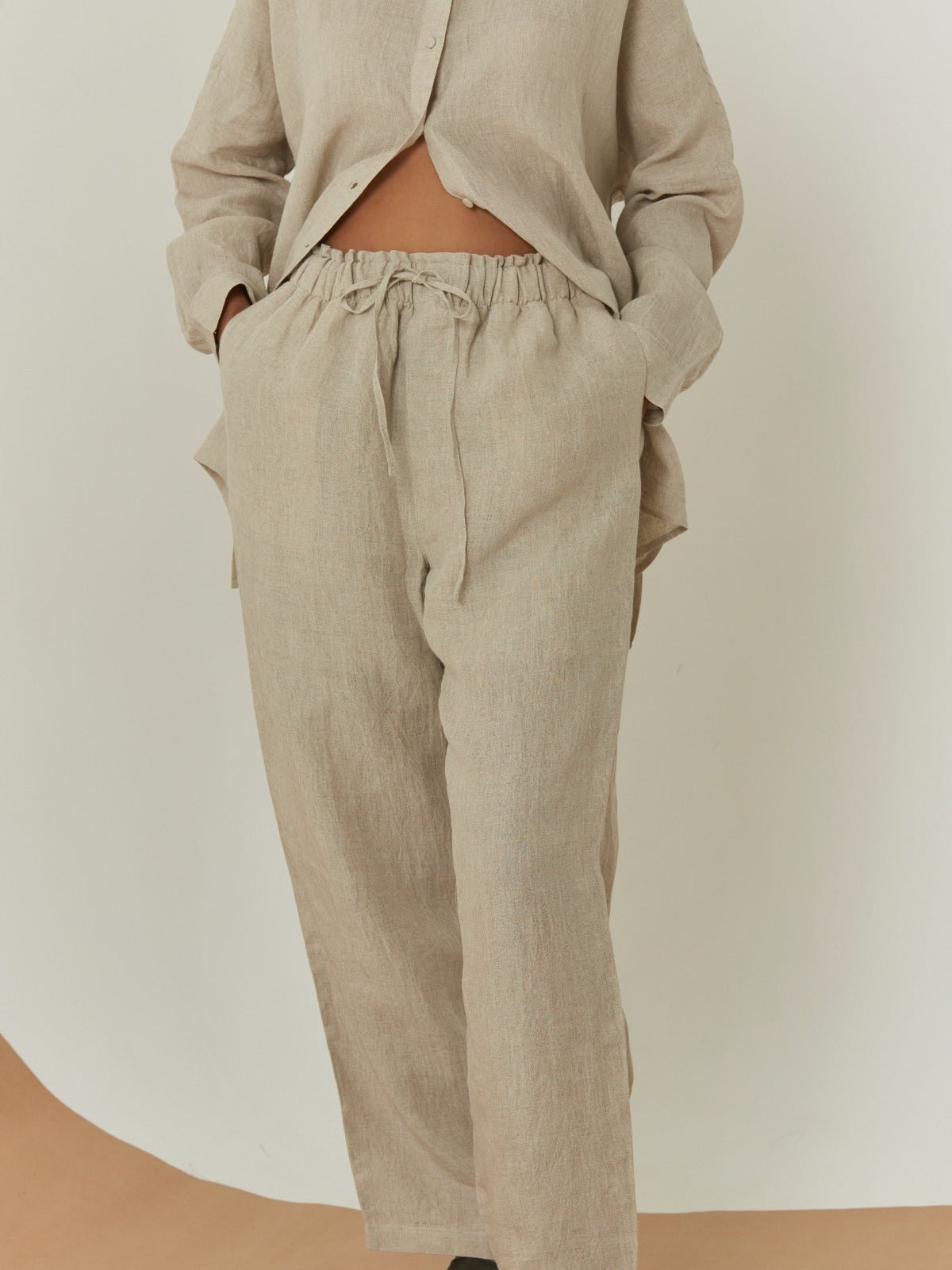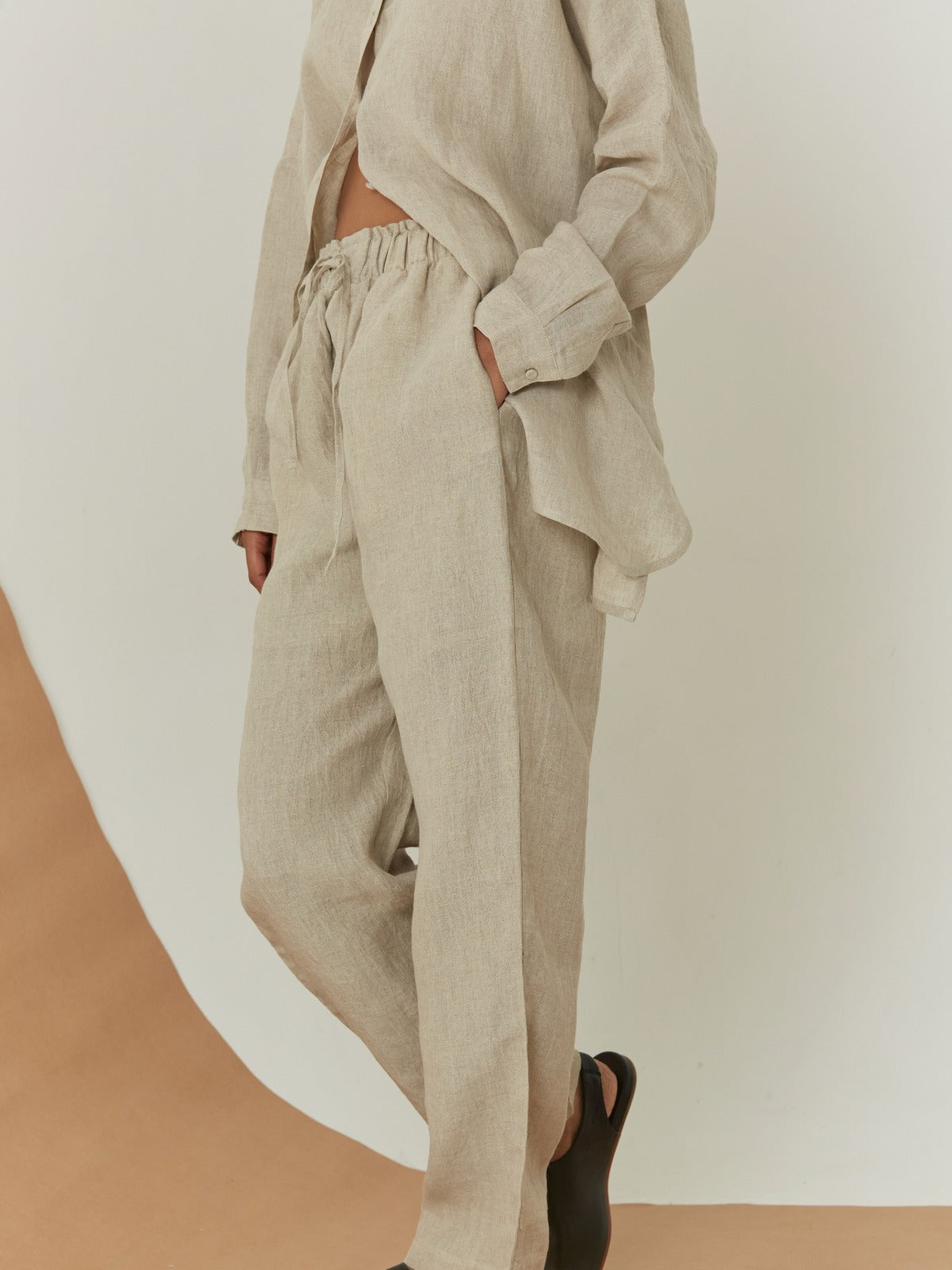 Discover ultimate ease with the Zai pant, crafted from 100% handwoven linen for exceptional breathability and comfort. Designed for a relaxed fit, these pants feature a flexible elasticated waistband and a functional drawstring for personalized comfort. The beauty lies in the details: the unbleached linen fabric, with its natural character, is handwoven with care in Phulia, Bengal, a testament to traditional textile artistry. Each pair is then constructed in Bengaluru.