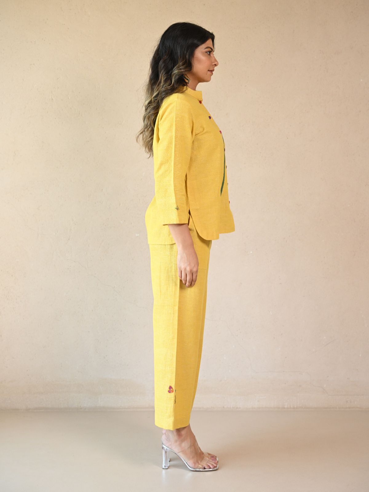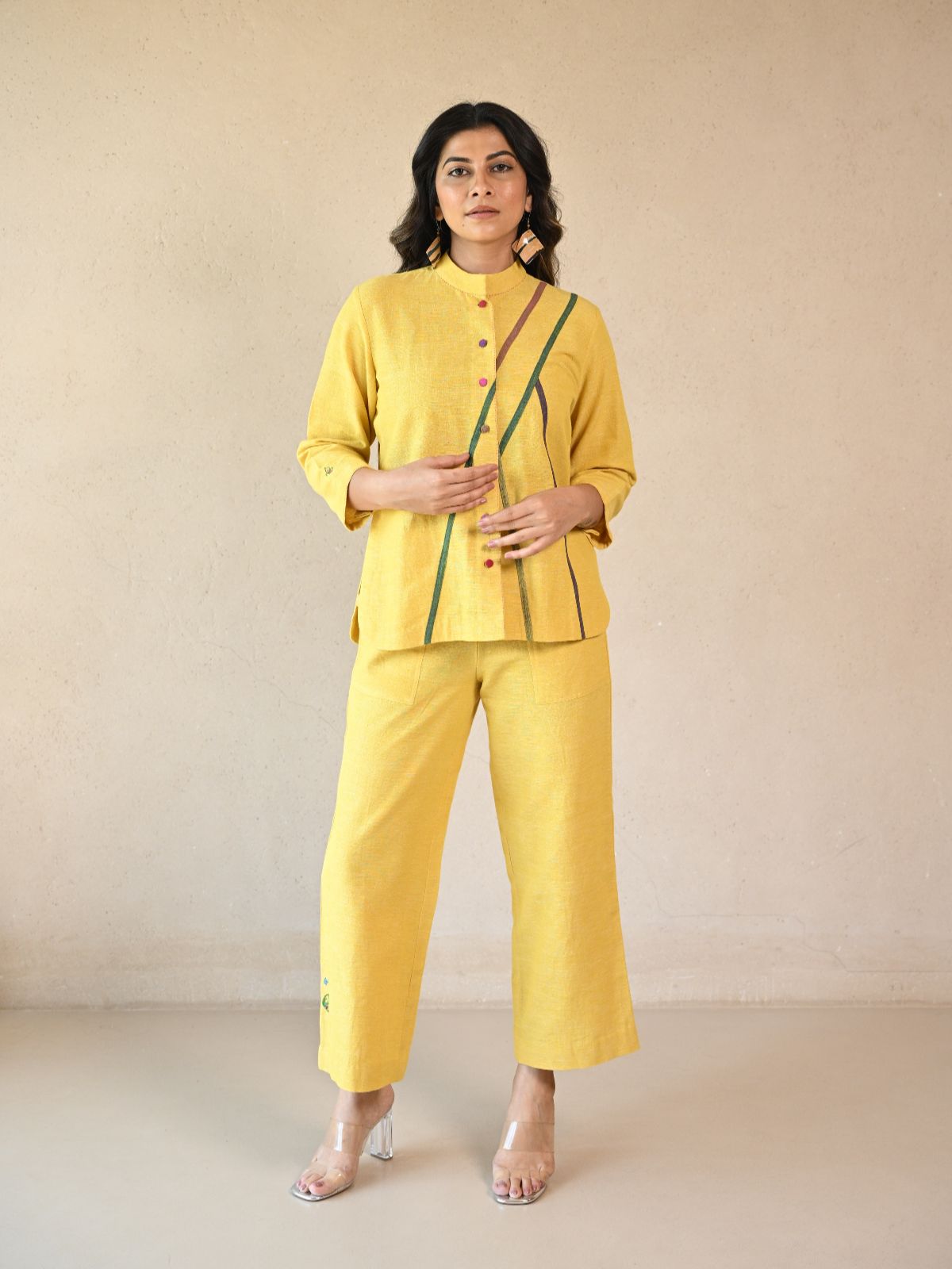 Embrace elegance with the Zuri shirt, featuring a fabric panel detail with multi color button. Crafted from organic handwoven Kala cotton, this shirt is adorned with intricate hand embroidery including fabric panel. The yellow hue provides a timeless appeal, while the comfortable fit ensures it is perfect for any causal occasion. Experience the blend of casual and modernity with this exquisite piece.